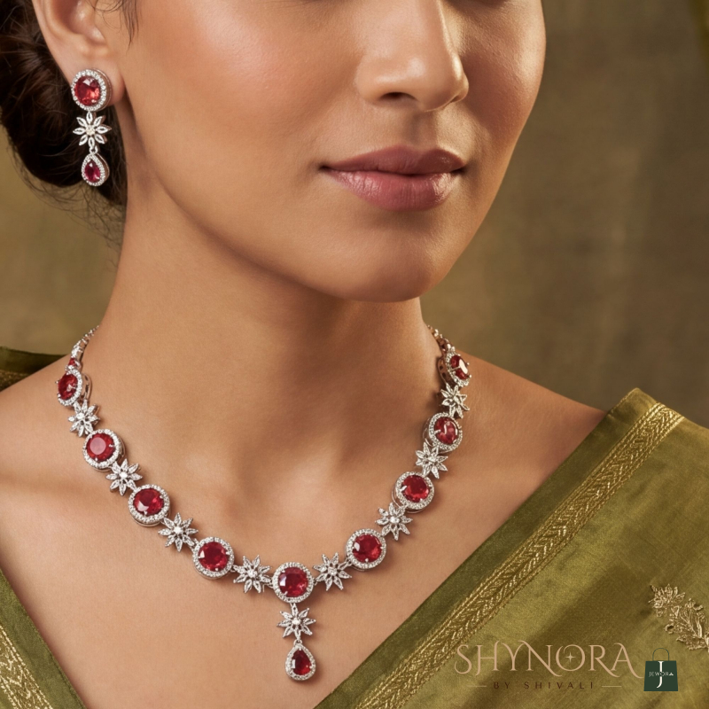 The central ruby red teardrop pendant enhances the beauty of the neckline, making it ideal for weddings, receptions, festive occasions, and evening parties. The matching earrings mirror the same blossom and drop design, completing the look with effortless sophistication.
