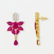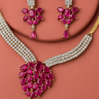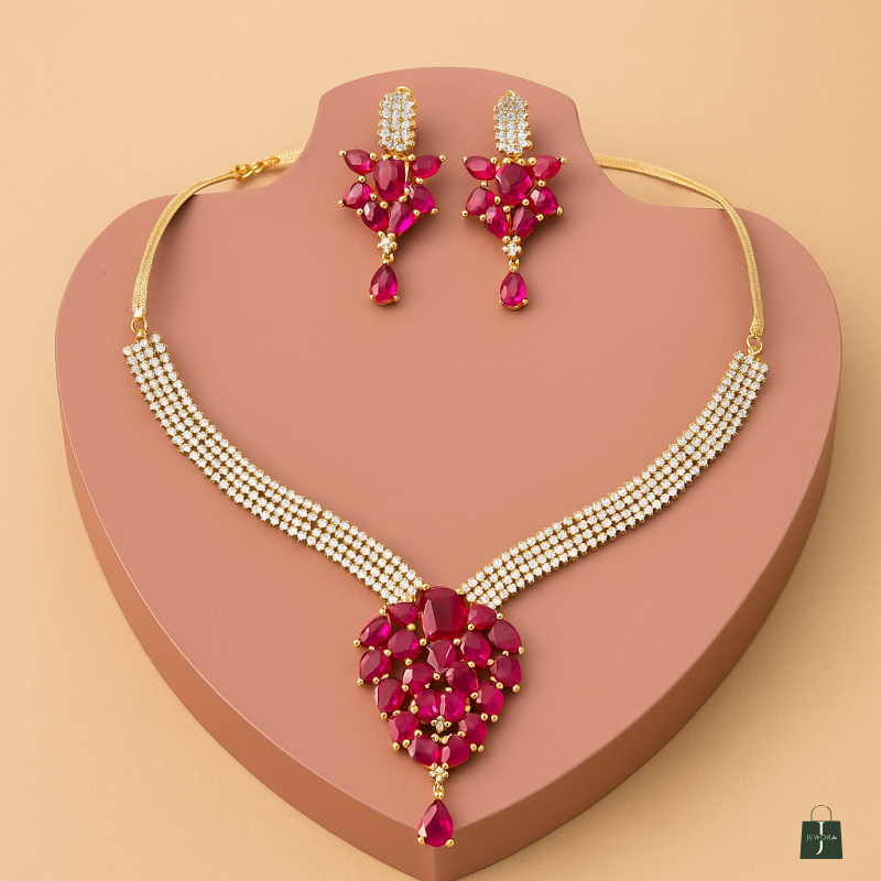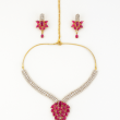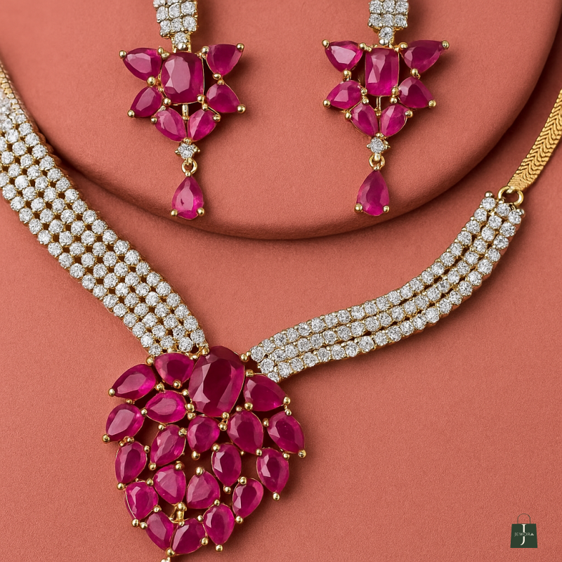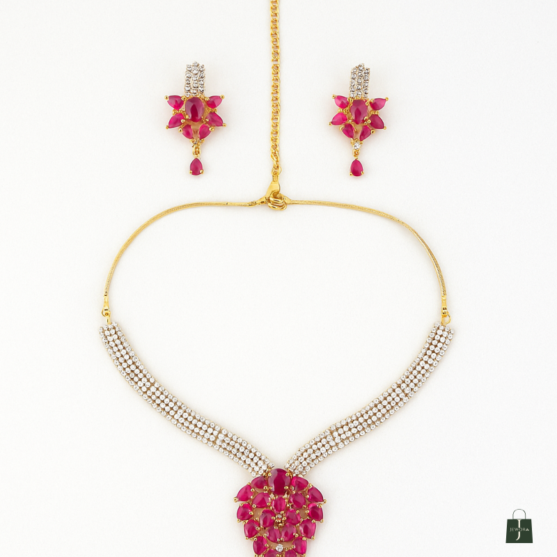The Ruby Red & CZ Diamond Necklace Set is a striking combination of elegance and bold beauty. Crafted with a durable alloy base and plated in radiant gold, this set features brilliant American Diamonds (CZ) that highlight a centerpiece adorned with vivid ruby-red gemstones. The necklace design flows with a dual band of sparkling CZ stones on either side, leading to a clustered floral drop of ruby gems, enhanced by a delicate teardrop accent. Accompanied by a matching pair of earrings, this set perfectly blends contemporary style with timeless charm. Ideal for festive occasions, weddings, and special parties, it brings out the richness of traditional Indian jewelry with a modern twist. Lightweight yet impactful, the Ruby Red & CZ Diamond Necklace Set adds a luxurious touch to ethnic and Indo-western outfits alike.