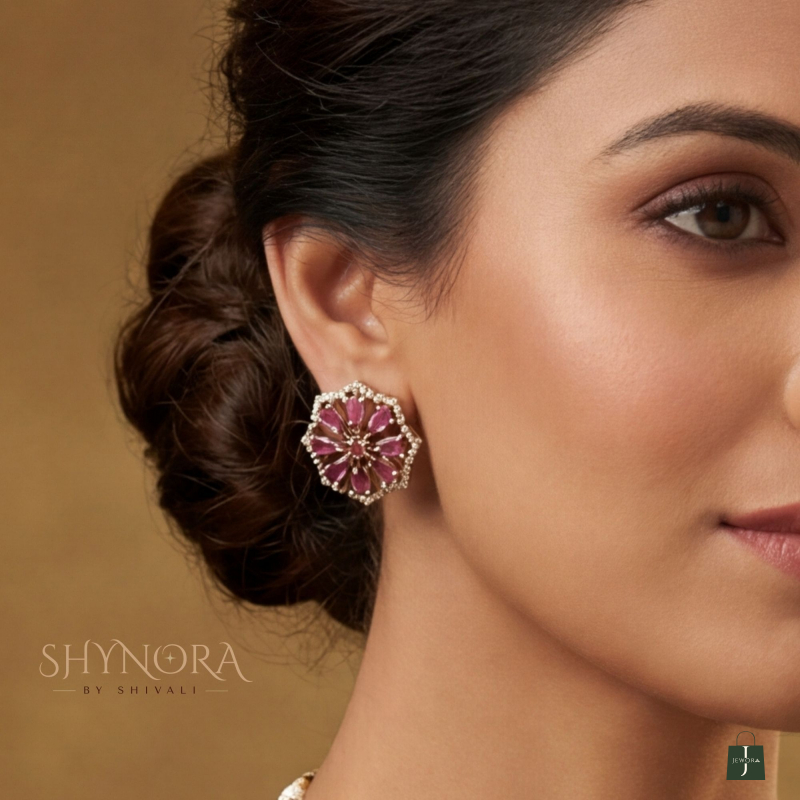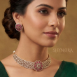 The Ruby Red Floral AD Choker Set is a beautiful and elegant jewelry set designed for weddings and festive occasions. The choker features a gold-finish mesh design highlighted with a ruby red floral centerpiece, surrounded by sparkling American Diamonds that add a rich and royal look.