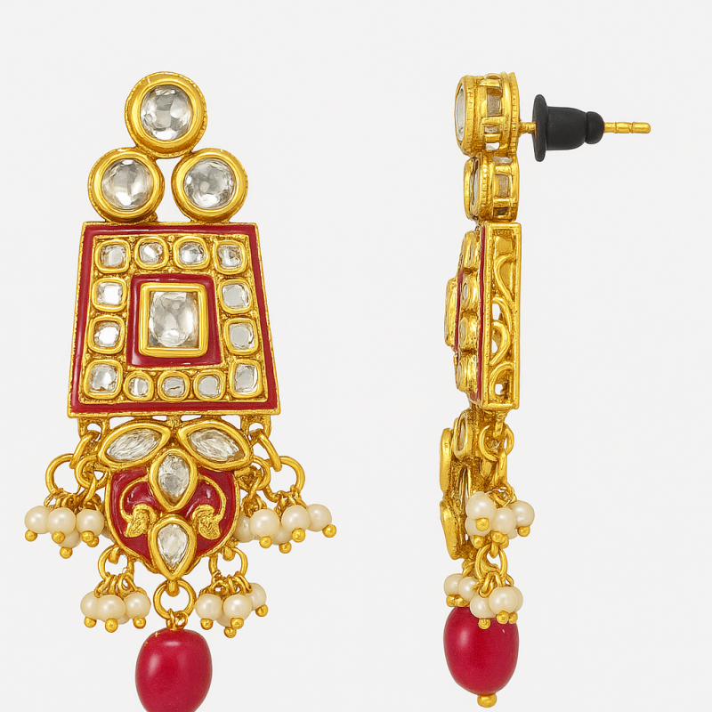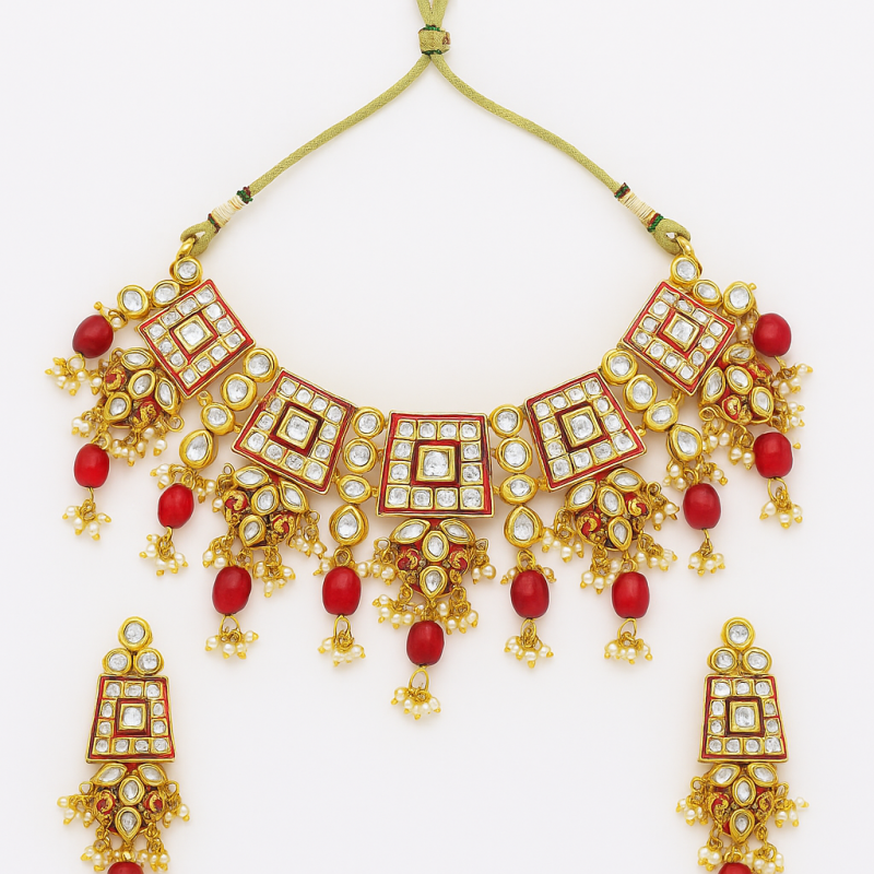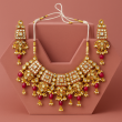 Add a royal touch to your bridal look with this Ruby Red Kundan Choker Set. This luxurious set includes a broad choker-style necklace adorned with intricate kundan work, golden detailing, and bold ruby red beads, paired with matching statement earrings. The heavy craftsmanship and rich design make it an ideal choice for brides, wedding functions, and festive occasions. A true blend of traditional heritage and modern elegance, this jewellery set ensures you shine with unmatched grandeur. Exclusively available on Jewora, your trusted artificial jewellery marketplace.