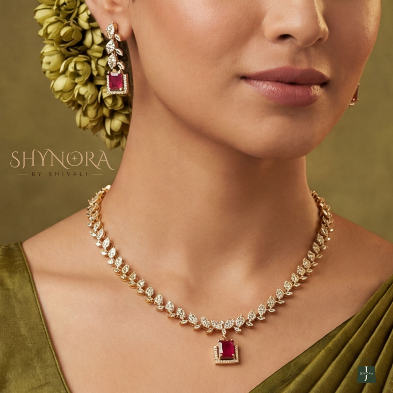 The Ruby Red Leafline AD Necklace Set with Maang Tikka is a beautifully balanced design that blends elegance with simplicity. The necklace features a delicate leaf-inspired AD chain, highlighted by a classic ruby red square pendant that adds a rich pop of color.