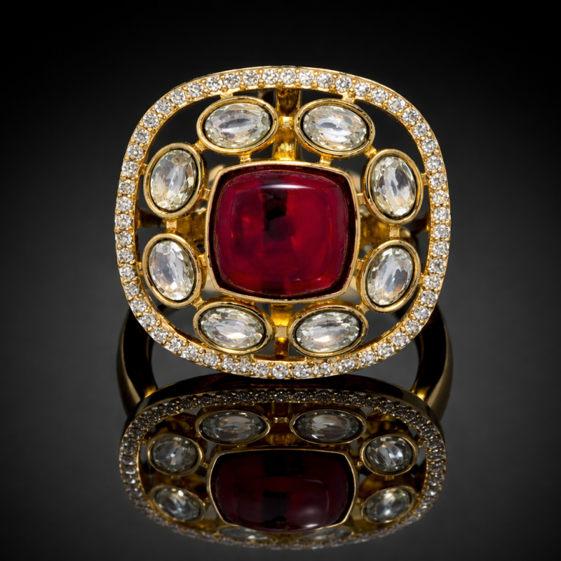 A stunning gold-tone ring featuring a bold, square-cut red gemstone at its centre, surrounded by six oval clear stones set in a golden bezel. The outer rim is encrusted with tiny sparkling stones forming a decorative frame. Ideal for elegant, everyday styling or festive wear.