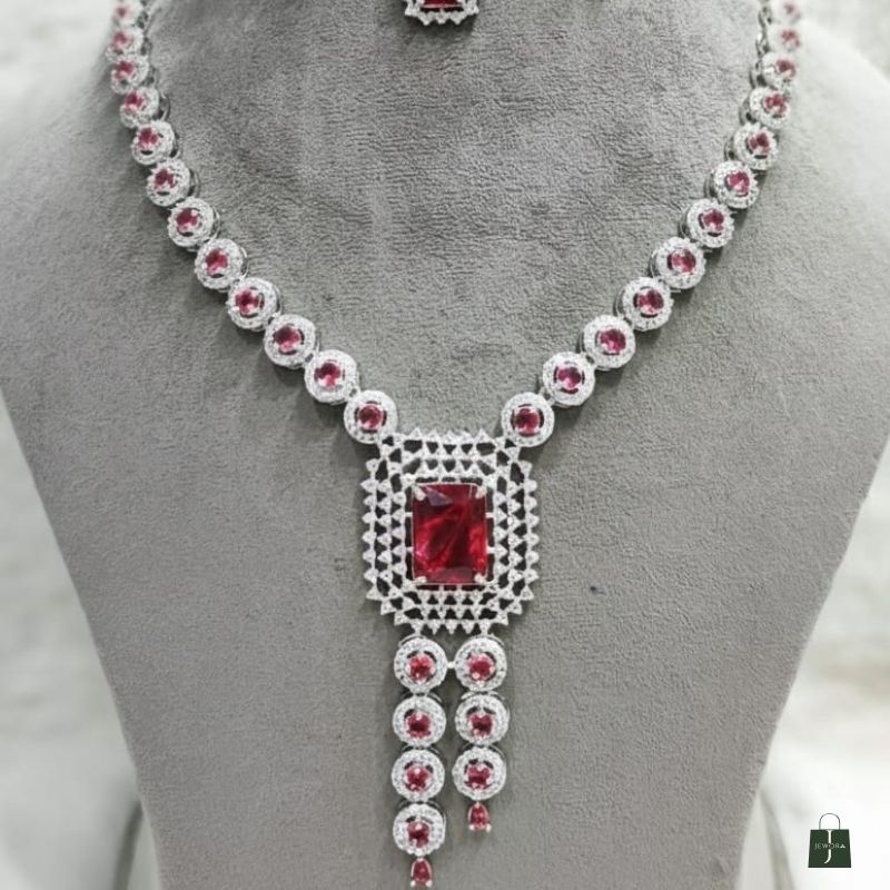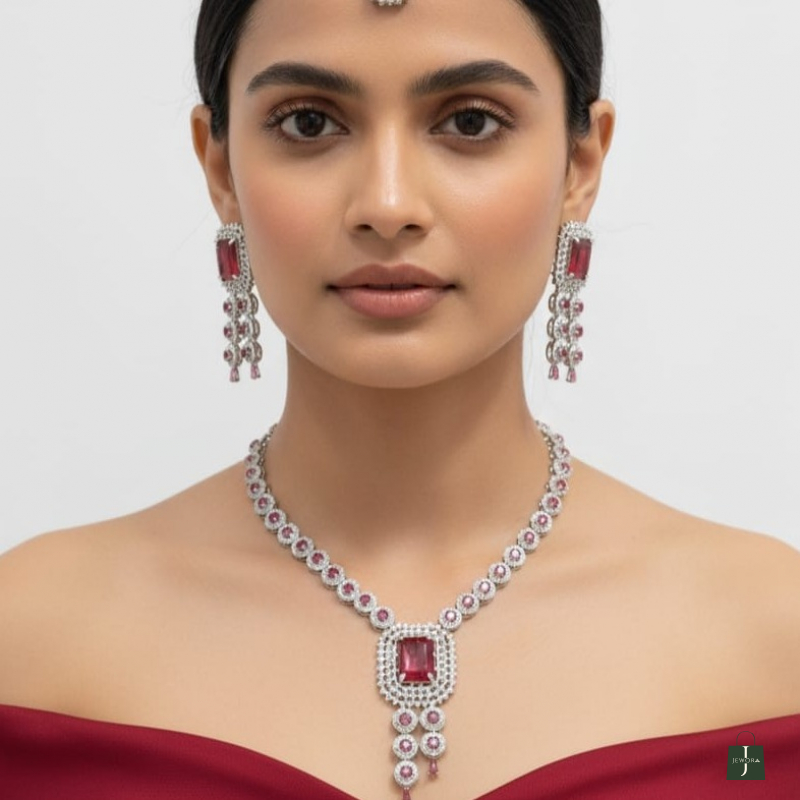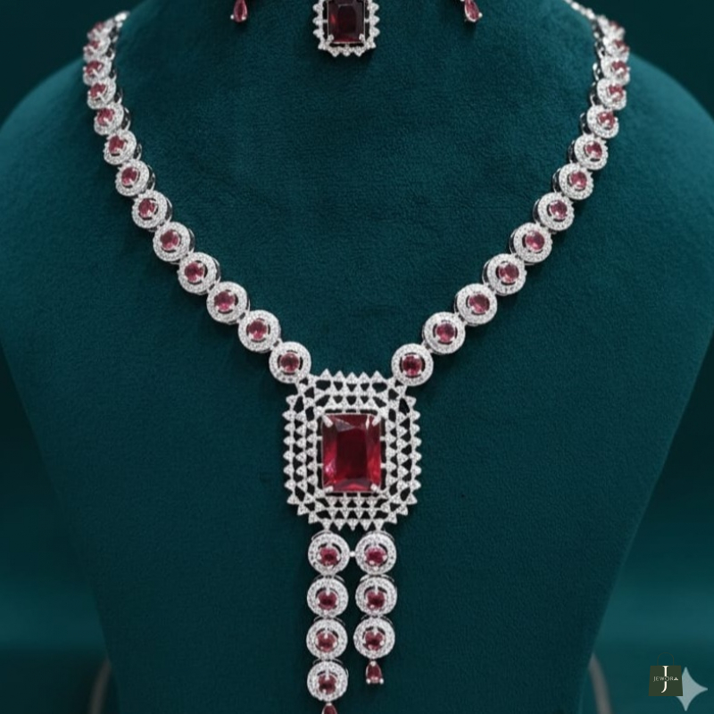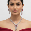 Make a grand entrance with the Ruby Regal Geometric Bridal Necklace Set. Designed with striking rectangular ruby-red centerpiece stones, this luxurious set showcases bold geometry combined with intricate crystal halo detailing.