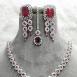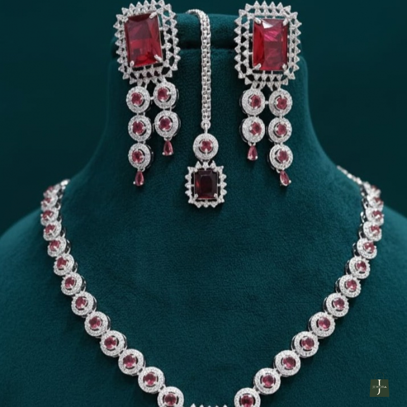 The necklace features a beautifully structured silver-tone frame adorned with shimmering white stones and deep red accents that create a rich contrast. The statement pendant adds depth and grandeur, while the long drop earrings and matching maang tikka complete the majestic bridal look.