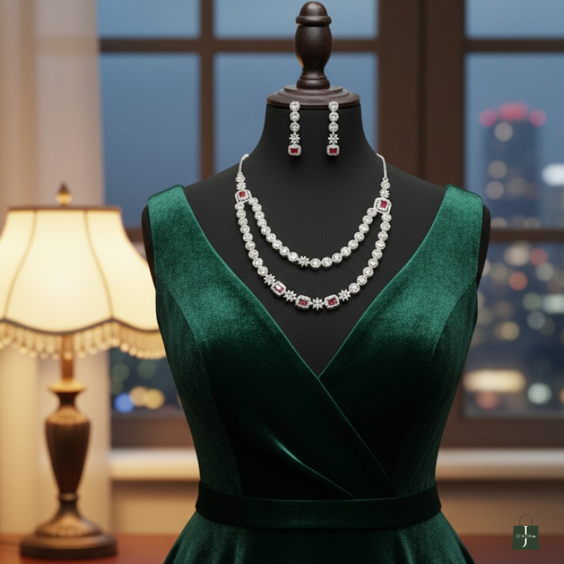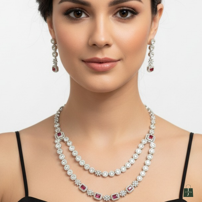 Step into timeless sophistication with this exquisite double-strand ruby-inspired necklace set. Designed with two graceful layers of shimmering American Diamonds, the necklace is accented with striking ruby-red square stones that add a rich pop of color and regal charm. The matching drop earrings mirror the refined diamond and ruby detailing, completing the elegant ensemble. Perfect for cocktail evenings, receptions, and formal celebrations, this set enhances your look with classic glamour and modern brilliance.