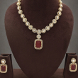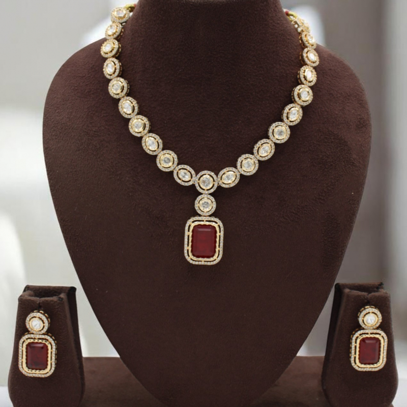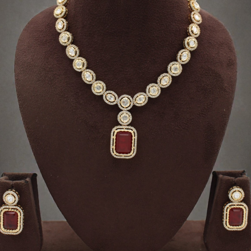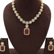 Make a bold and elegant statement with this stunning halo-style necklace set. Designed with perfectly aligned circular stone motifs, this piece features a striking rectangular red centerpiece pendant that adds richness and charm. The sparkling white stones surrounding each element enhance its luxurious appeal. Paired with matching geometric drop earrings, this set is perfect for festive celebrations, receptions, and special occasions.