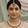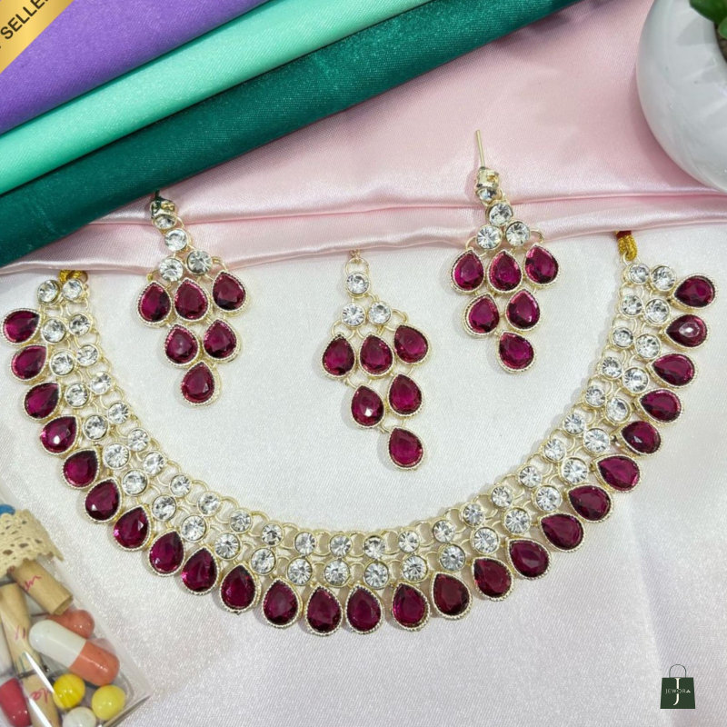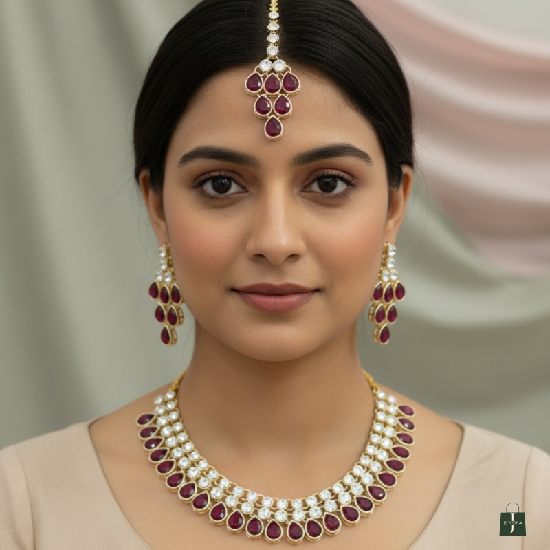 The Ruby Royale Kundan Necklace Set features a stunning arrangement of deep red teardrop stones paired with sparkling white kundan crystals in a rich gold polish finish. The layered design creates a bold and luxurious look, while the matching earrings complete the elegant set. This necklace set is perfect for weddings, parties, festive occasions, and bridal wear, adding a royal and glamorous touch to any traditional outfit.