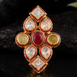 A stunning gold-tone ring featuring a symmetrical, diamond-shaped design with nine gemstones. The centerpiece is an oval red ruby set in gold, surrounded by eight transparent, faceted stones (likely kundan or diamond-like) in pear and square cuts. Each stone is framed with a red enamel border and gold detailing, giving the piece a regal, traditional look. Perfect for festive or ethnic wear.