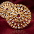A stunning gold-toned circular ring featuring three concentric rings of sparkling white Kundan stones in teardrop and round cuts. The center showcases a deep ruby‑red gem surrounded by a halo of tiny white stones, set in an elegant gold filigree design. Perfect for adding regal, traditional flair to outfits or accessories. ✨