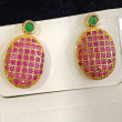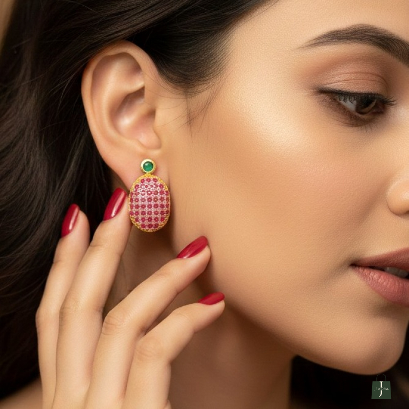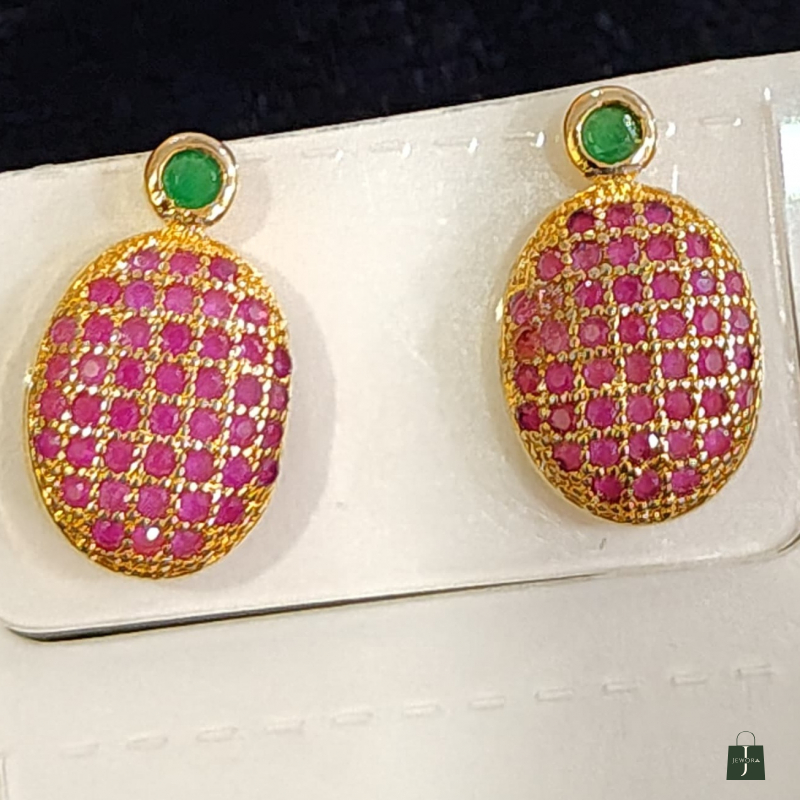 Add a touch of royal sophistication to your jewelry collection with these Ruby Royale Oval Stud Earrings. Designed in a graceful oval silhouette, the earrings are intricately studded with multiple tiny ruby-pink stones arranged in a precise micro pattern, creating a rich and luxurious texture.