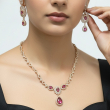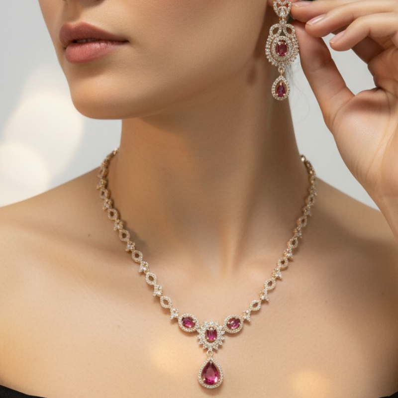 Radiate timeless sophistication with this stunning ruby-inspired necklace set. Crafted in a graceful gold-toned finish, the necklace features oval ruby-pink stones framed by shimmering American Diamonds, leading to a striking pear-shaped drop pendant at the center. The matching drop earrings mirror the same halo and teardrop design, creating a refined and balanced look. Perfect for evening parties, receptions, and festive occasions, this set adds a touch of royal charm and elegance to any ensemble.