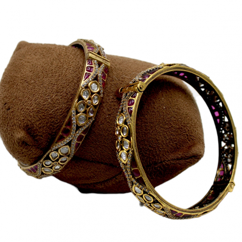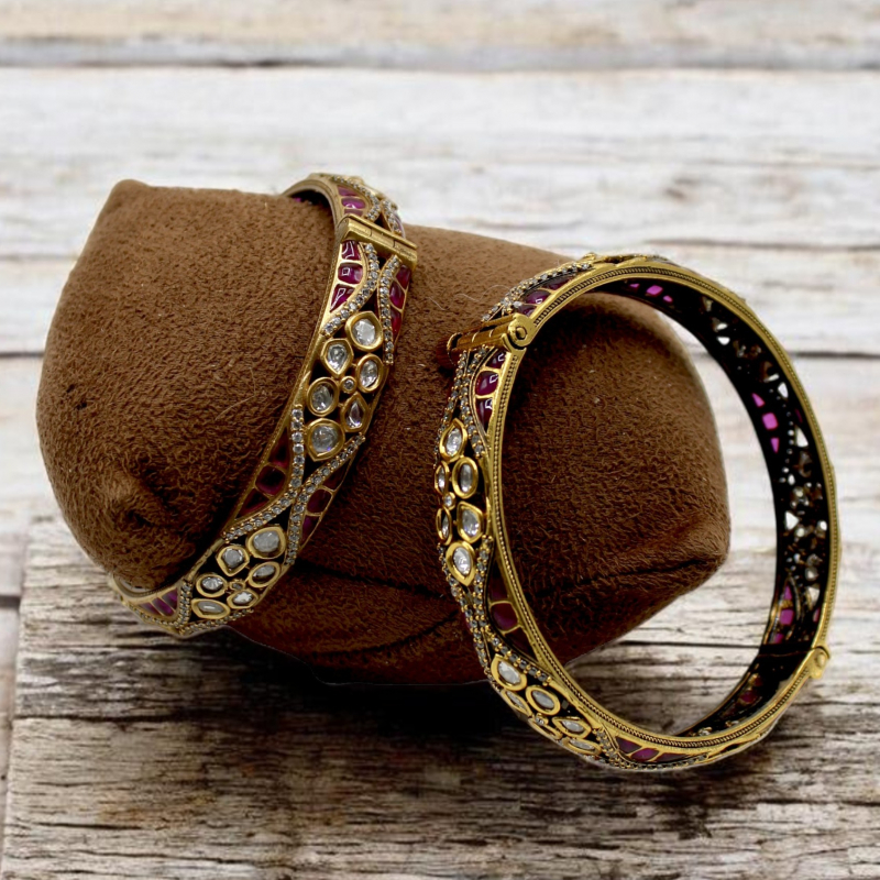 Elevate your ethnic look with this elegant pair of handcrafted Kundan Polki bangles. Designed in a graceful swirl pattern, these bangles feature shimmering uncut white stones beautifully accented with rich ruby pink enamel work. The fine micro stone borders enhance the overall brilliance, while the premium gold polish adds a luxurious finish. Perfect for weddings, festive occasions, and bridal wear.