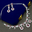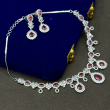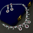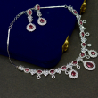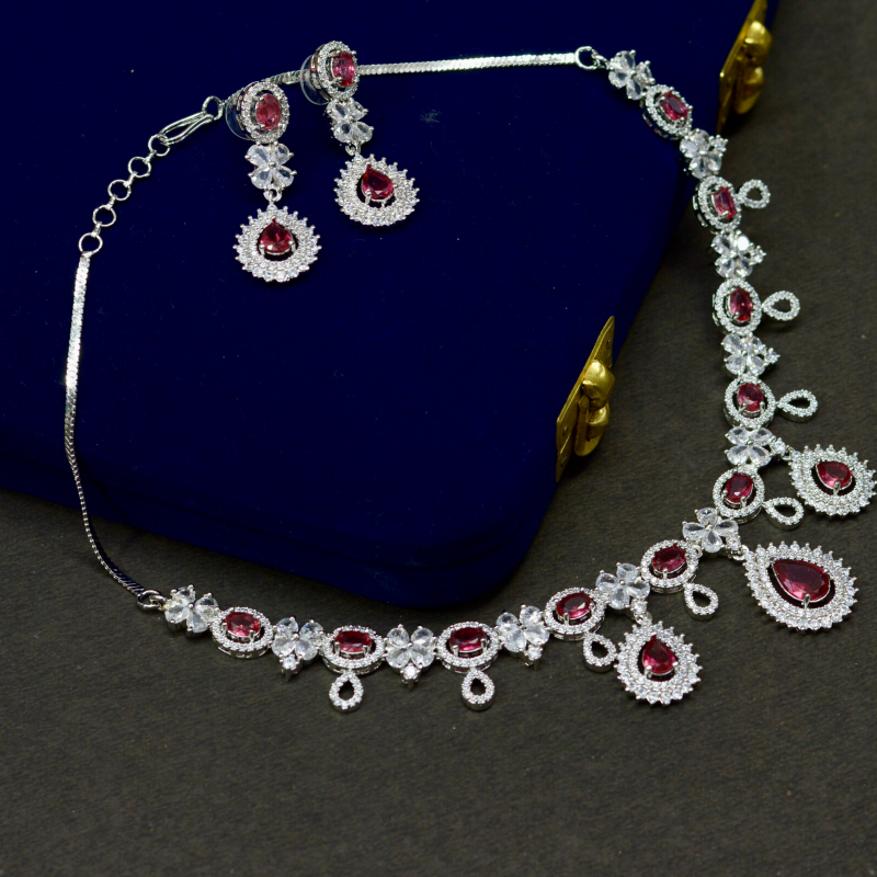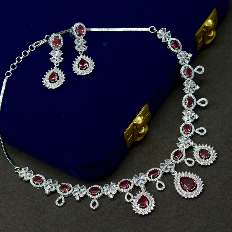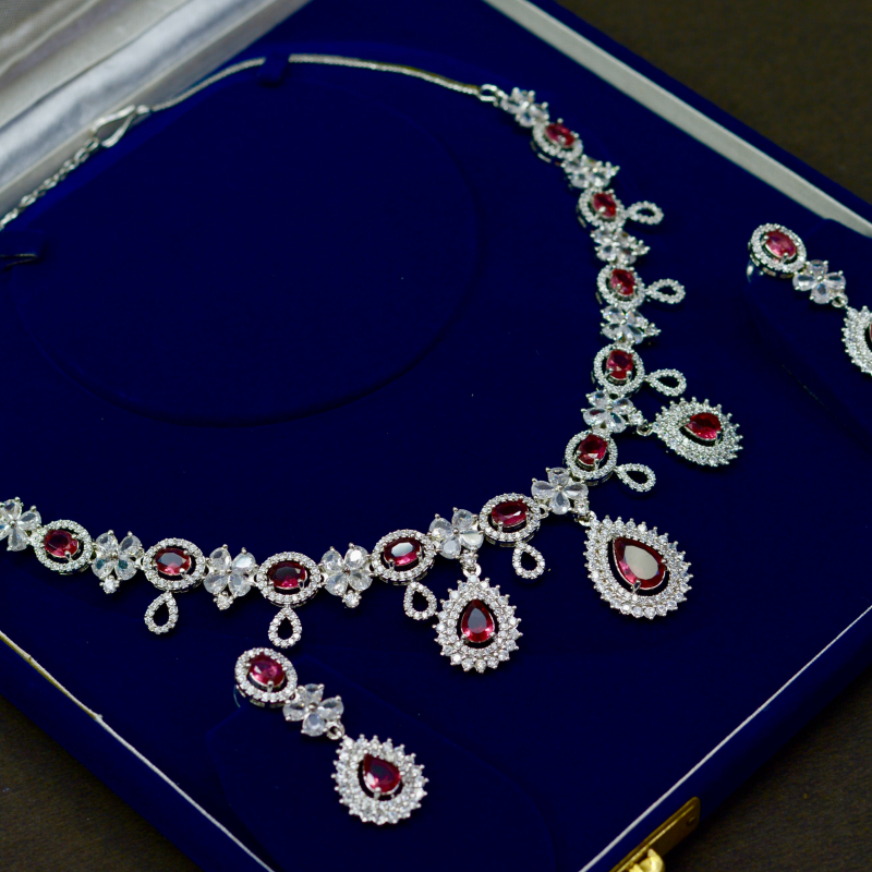 Bold ruby teardrop elements define this statement necklace set, creating a dramatic yet graceful look. The precise stone placement and radiant sparkle deliver premium visual depth, making it perfect for weddings, festive events, and evening occasions while remaining stylishly budget-friendly.