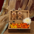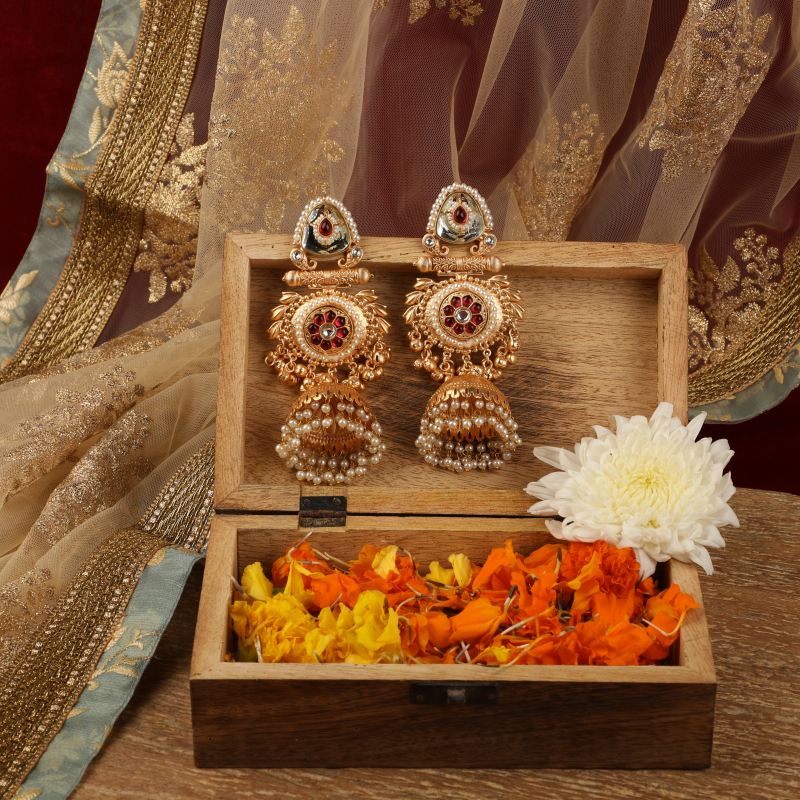 Add a touch of opulence to your festive ensemble with these exquisitely handcrafted statement jhumka earrings, rooted in classic Indian craftsmanship. The earrings feature an elegant teardrop-shaped stud adorned with mirror-style detailing, delicate pearl edging, and a ruby-toned accent that lends a regal finish.