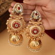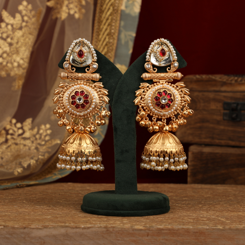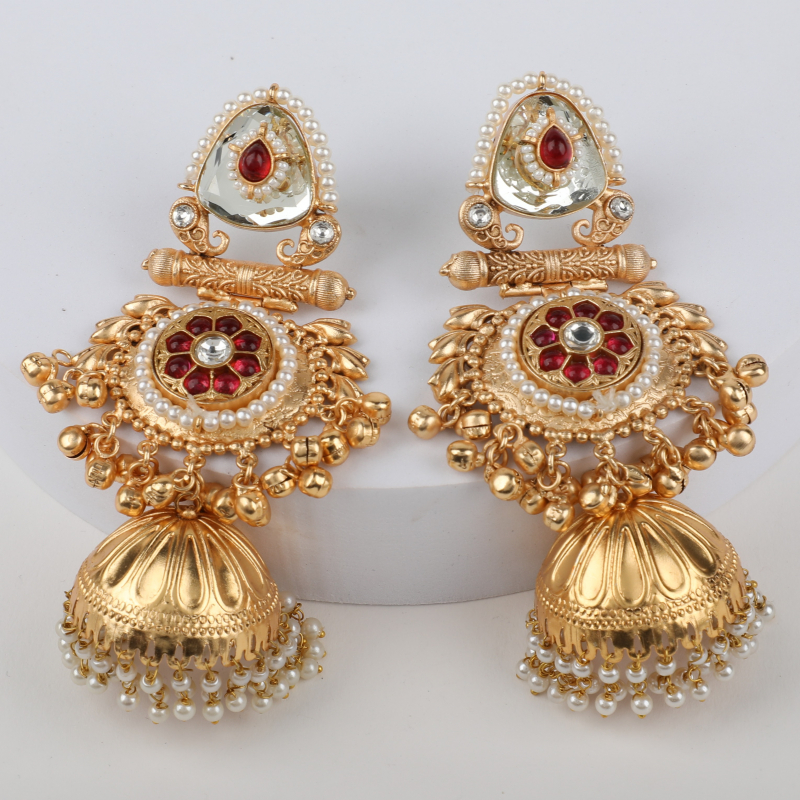 Below the stud, an ornate circular motif is beautifully embellished with red stone inlay, fine pearl accents, and tiny gold bead detailing, creating a rich, layered look. The design is completed with a bold gold-toned dome jhumka, finished with a fringe of dainty pearls that sway gracefully with every movement.