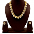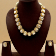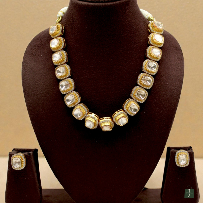 The necklace is paired with matching Polki stud earrings that complete the coordinated look. Perfect for weddings, festive occasions, receptions, and elegant evening events, this set offers a royal yet minimal aesthetic.