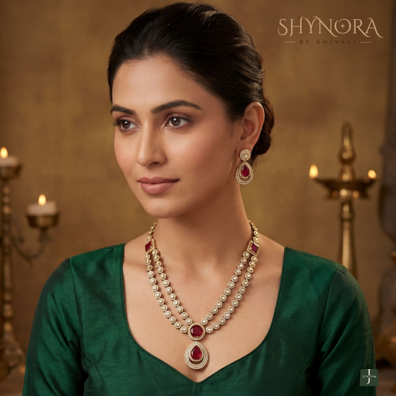 The balanced, minimal-yet-luxurious design makes it perfect for brides and festive occasions where understated royalty is key. The matching ruby drop earrings mirror the pendant beautifully, completing a refined and graceful look.