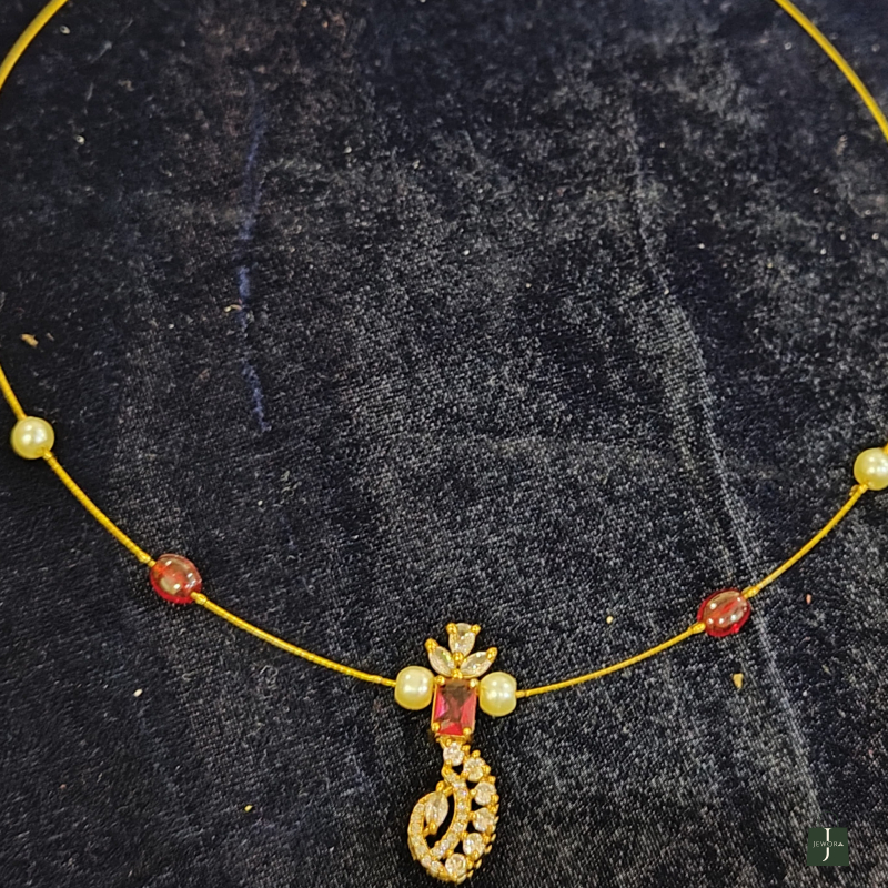Neeche curved drop design American Diamonds (CZ) se studded hai, jo graceful sparkle deta hai. Chain par red beads aur pearl accents diye gaye hain jo design ko balanced aur classy finish dete hain.