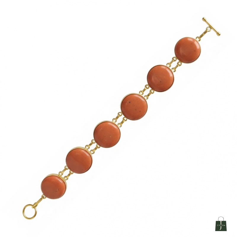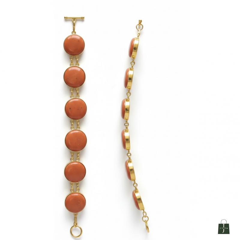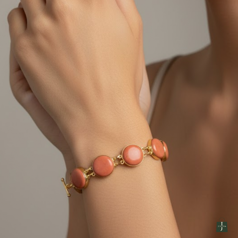 A chic bracelet featuring earthy rust-toned round stones set in a glossy golden frame. Elegant, minimal, and perfect for both daily wear and festive styling.
