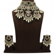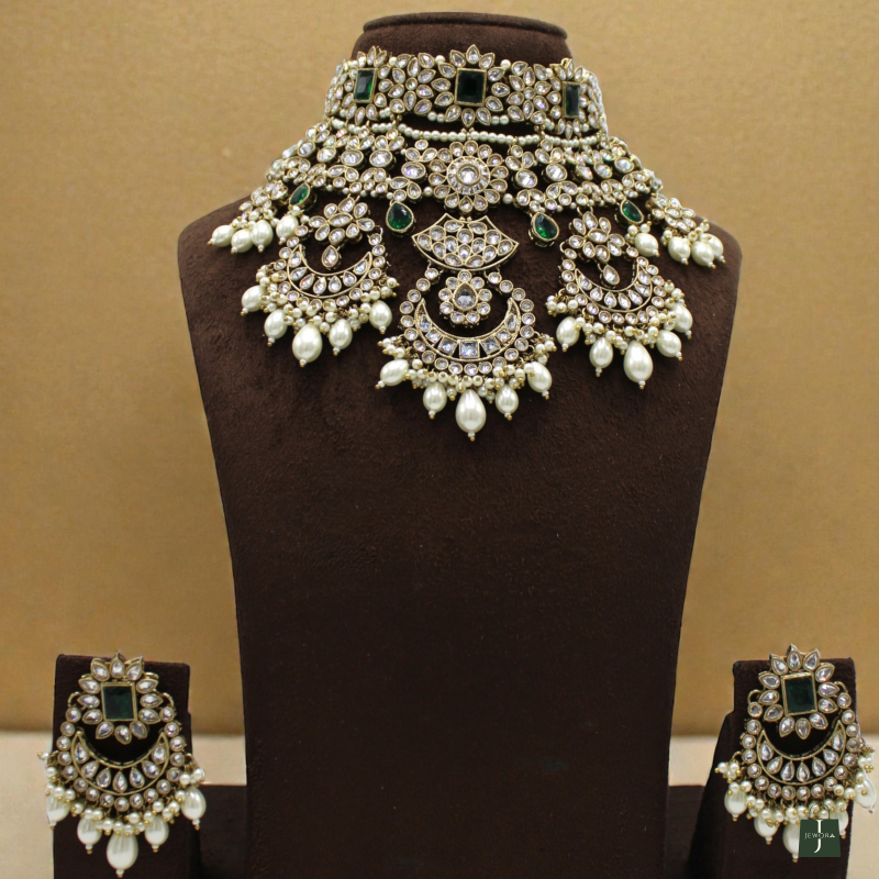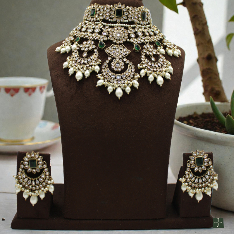 Make a majestic statement with this opulent bridal choker set, designed with intricate Polki craftsmanship and rich emerald-green accents. The layered choker features detailed floral and crescent motifs adorned with sparkling Polki stones, highlighted by rectangular emerald-green centre stones that add depth and royal charm.