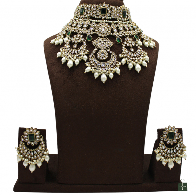 Delicate pearl drops gracefully hang from the lower motifs, creating beautiful movement and enhancing its bridal elegance. Paired with matching statement earrings featuring emerald stones and pearl danglings, this set is perfect for brides, receptions, and grand wedding celebrations.