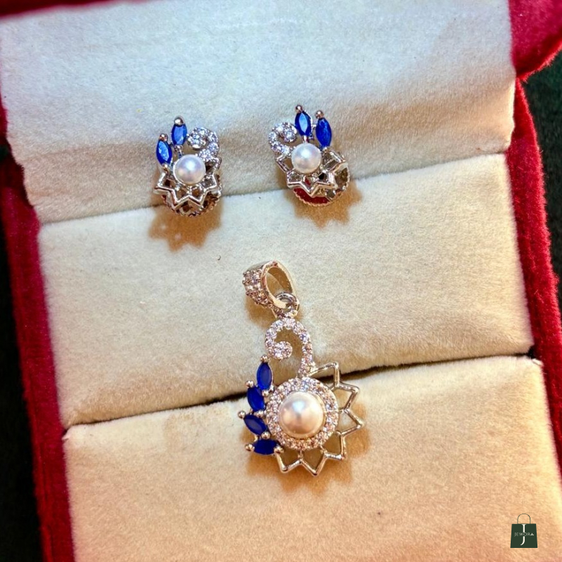 • Design: A coordinated pendant and earring set featuring a stylized floral/sunburst motif with a central pearl.