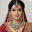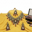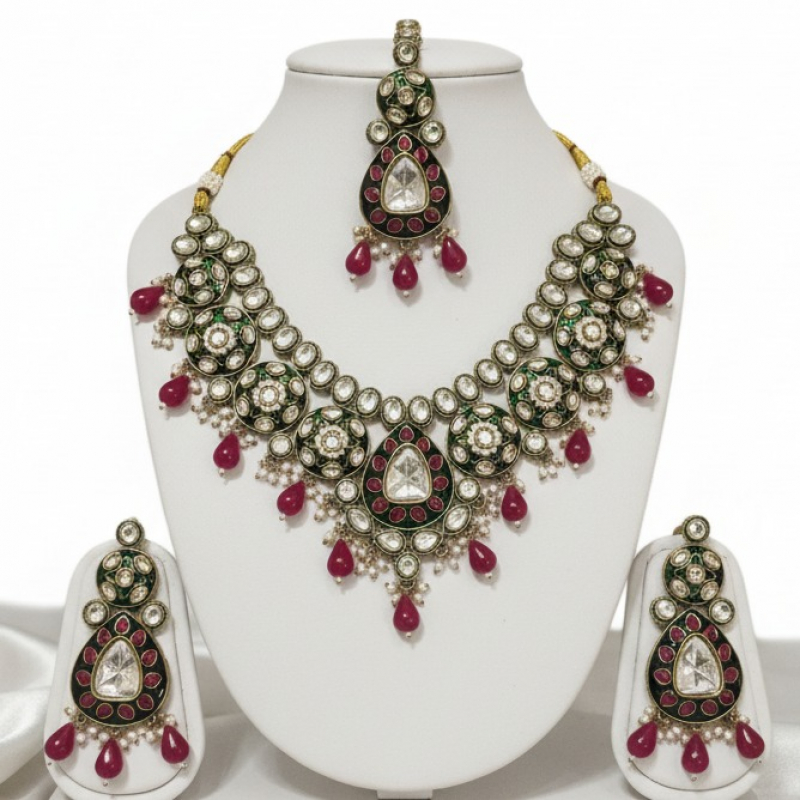 At the centre lies a striking teardrop polki pendant, encircled with deep ruby accents and finished with graceful ruby-red bead danglings that add fluid movement. The necklace is beautifully balanced with matching elongated drop earrings and a coordinating maang tikka, completing the bridal ensemble with regal harmony.