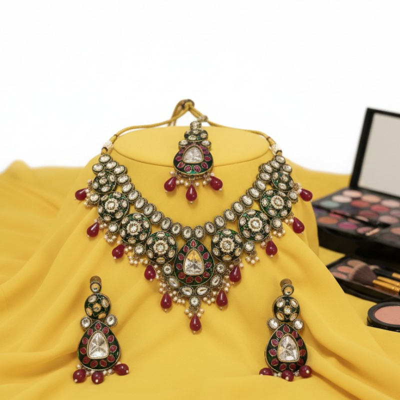 Step into royal elegance with the Shahi Gulnaar Kundan Bridal Set, a majestic composition of heritage artistry and vibrant colour. This statement necklace showcases circular floral motifs richly detailed with emerald green meenakari work and framed with luminous polki-style stones.