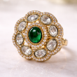 A stunning gold-toned adjustable ring featuring a circular design with a central oval stone surrounded by eight oval clear Kundan stones. Each Kundan stone is encircled with tiny sparkling zirconia accents, adding luxurious brilliance to the piece. Ideal for festive or everyday glamour, this ring offers elegant, traditional Indian craftsmanship with a modern touch.