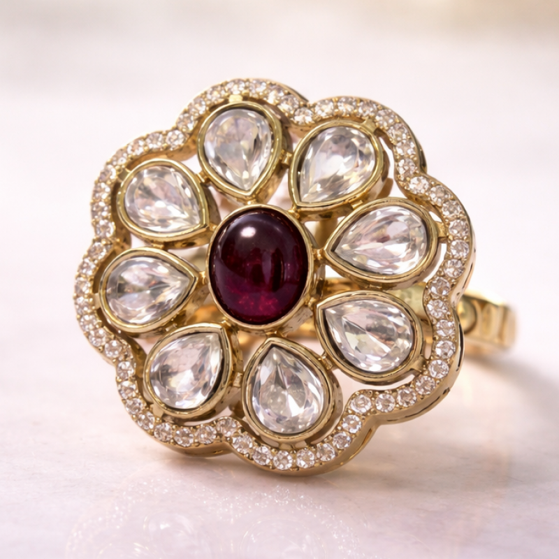 A stunning gold-toned adjustable ring featuring a circular design with a central oval stone surrounded by eight oval clear Kundan stones. Each Kundan stone is encircled with tiny sparkling zirconia accents, adding luxurious brilliance to the piece. Ideal for festive or everyday glamour, this ring offers elegant, traditional Indian craftsmanship with a modern touch.