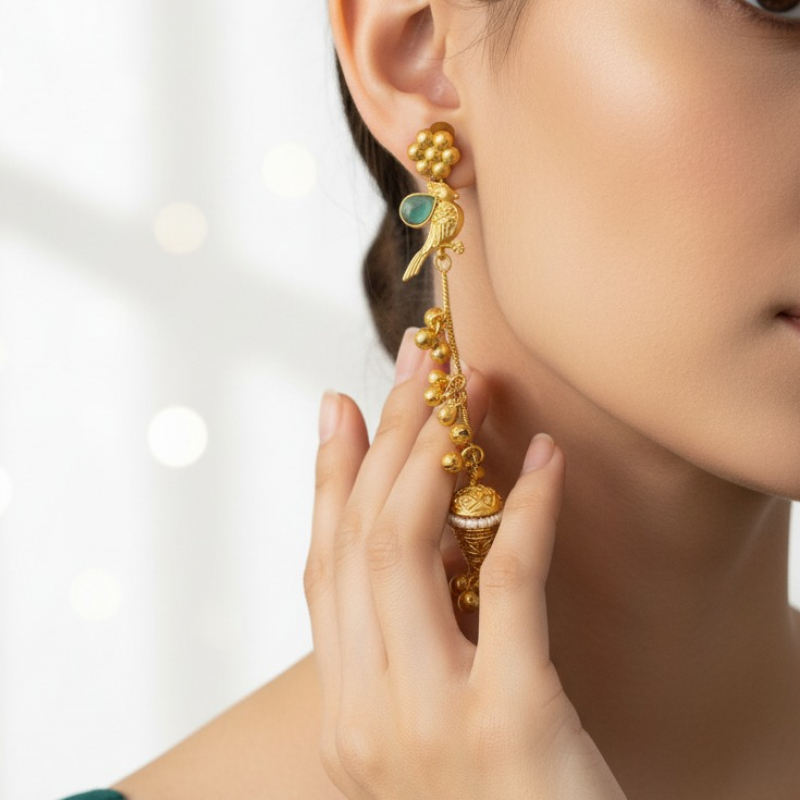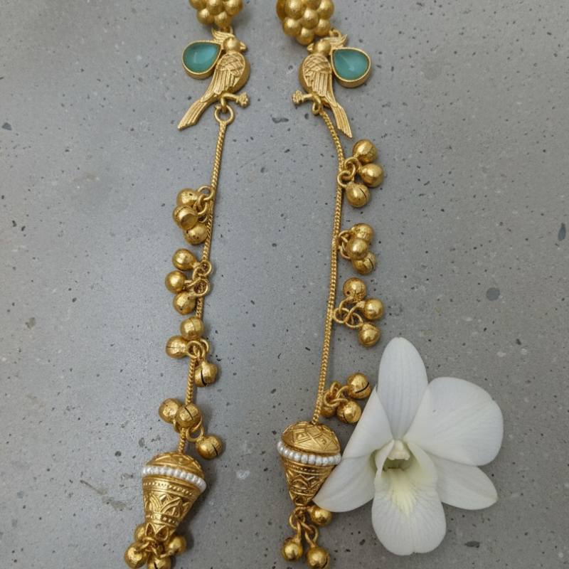 Add a touch of cultural elegance to your jewellery collection with the Shuka Ghungroo Heritage Drop Earrings. Inspired by traditional temple artistry, these earrings beautifully combine symbolic motifs with graceful movement.