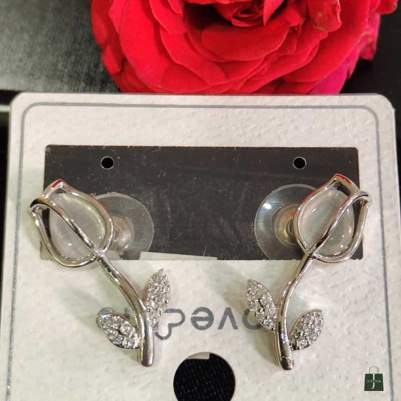 Gracefully designed to resemble a blooming tulip, these elegant stud earrings bring timeless sophistication to your jewelry collection. The soft pearl-sheen bud is beautifully wrapped in a sleek silver frame, while the delicately curved stem leads to shimmering crystal-studded leaves for a refined sparkle.