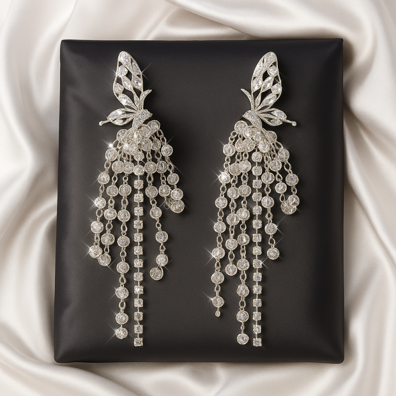 Crafted with high-quality alloy and finished in a radiant silver polish, these earrings are both durable and lightweight, ensuring comfort while adding maximum glam. Perfect for pairing with gowns, sarees, and cocktail dresses, they bring a touch of grace and luxury to any outfit.
