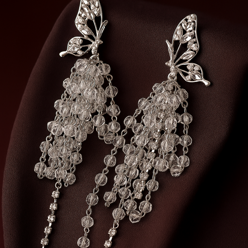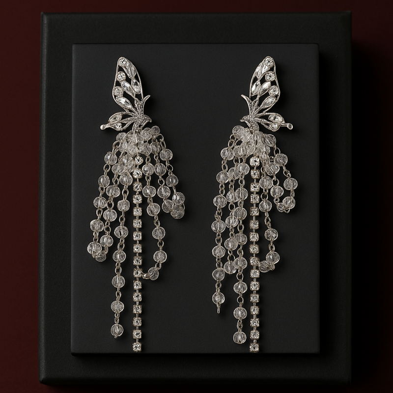 Step into elegance with the Silver Butterfly Drop Earrings, designed with sparkling American Diamond (CZ) stones and delicate butterfly motifs. The cascading drop chains shimmer beautifully with every movement, making these earrings a standout accessory for parties, festive occasions, and evening celebrations.