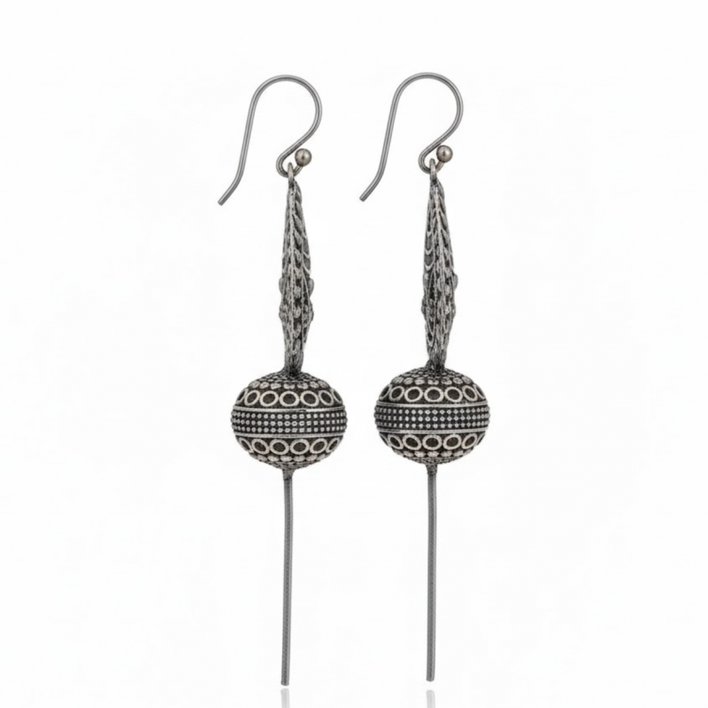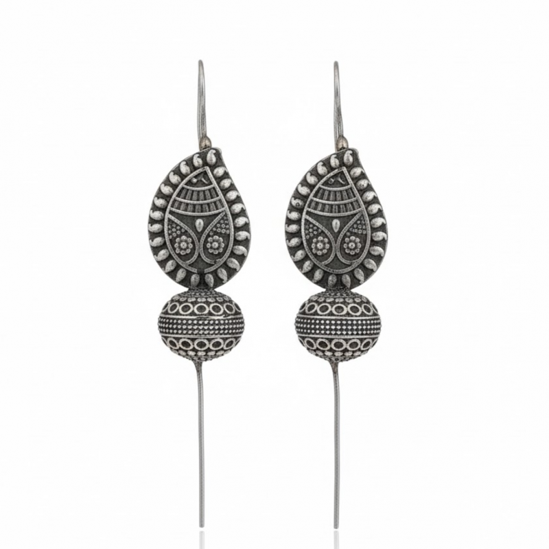 Add a touch of traditional charm to your jewellery collection with these beautifully crafted oxidised silver-plated long dangler earrings. Designed with an intricately engraved teardrop pattern on top and a detailed antique bead in the centre, these earrings create a unique and stylish ethnic look. The extended metal stick design adds a contemporary twist, making them ideal for women who love fusion fashion.