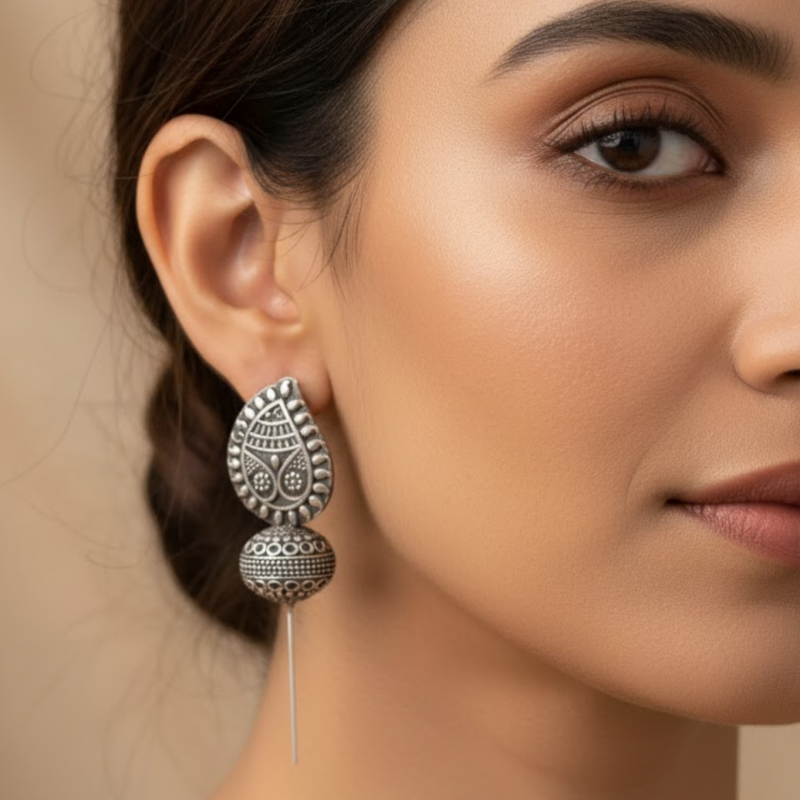 The earrings have a matte oxidised finish that enhances their handcrafted appeal. Lightweight and skin-friendly, they pair effortlessly with sarees, kurtis, salwar suits, lehengas, and Indo-western outfits—perfect for festive occasions, parties, cultural events, or everyday wear.