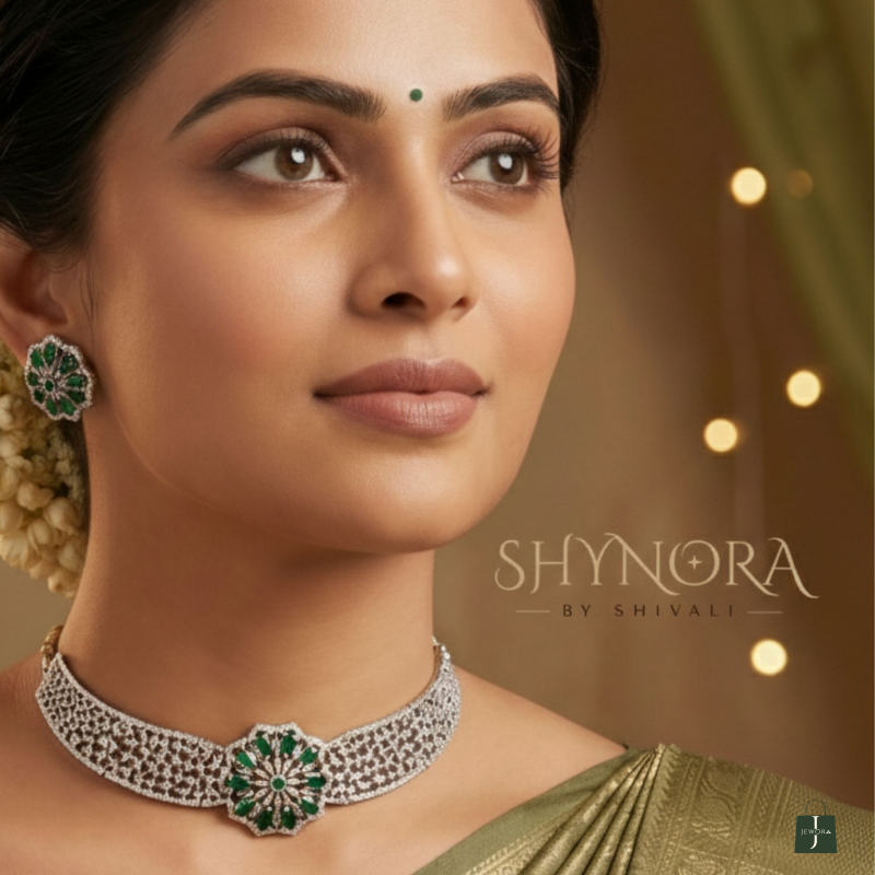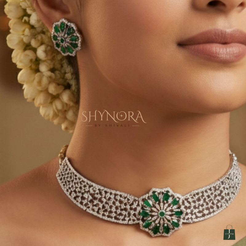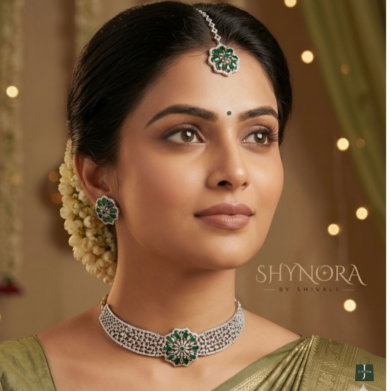 The Silver Finish AD Emerald Green Floral Choker Set with Maang Tikka is a stunning statement piece crafted for weddings and grand festive occasions. This elegant choker features a broad lattice-style AD band highlighted with a beautiful floral centerpiece in Emerald Green stones, giving it a rich and royal appearance.