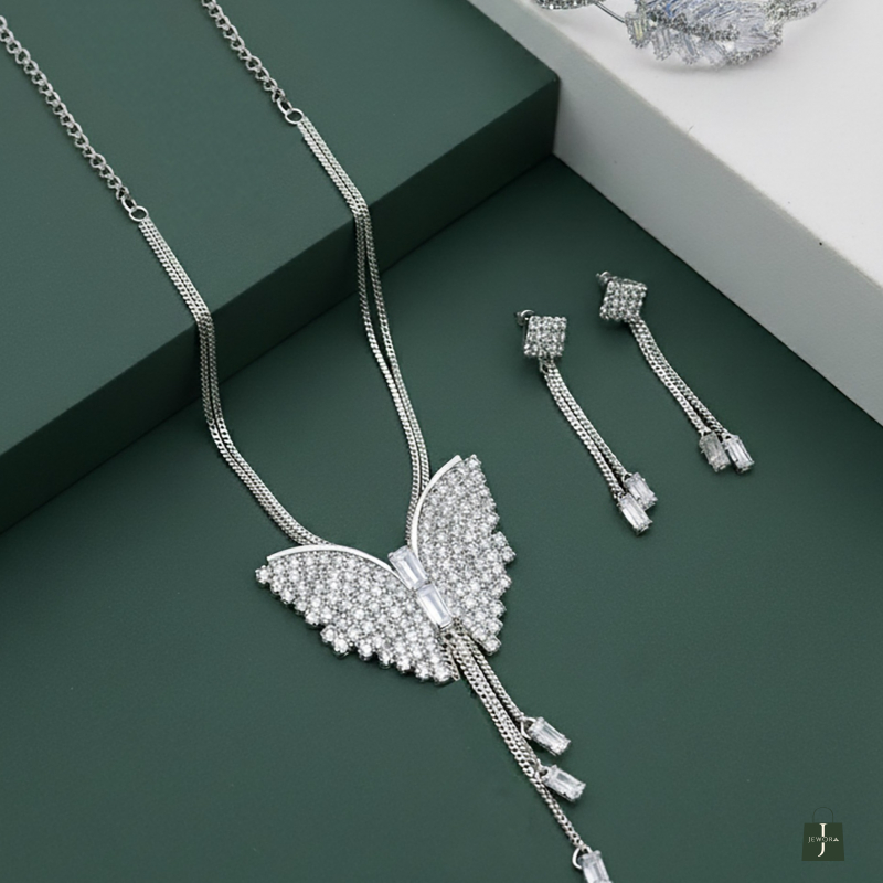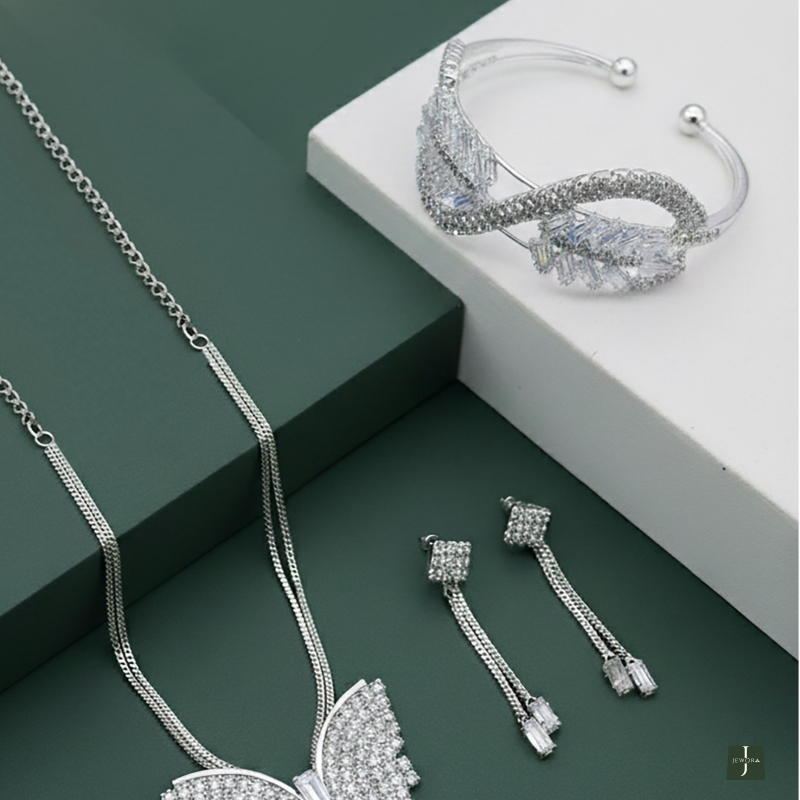 A luxurious and eye-catching jewellery set featuring a dazzling butterfly-inspired pendant crafted with shimmering white stones. The pendant is paired with sleek multi-layer chain detailing and elegant crystal drop accents for added movement and sparkle. The set includes matching drop earrings and a beautifully designed open cuff bracelet adorned with intricate stone work. Perfect for weddings, receptions, cocktail parties, and grand festive occasions, this set brings a refined glamour to any outfit.