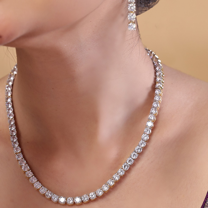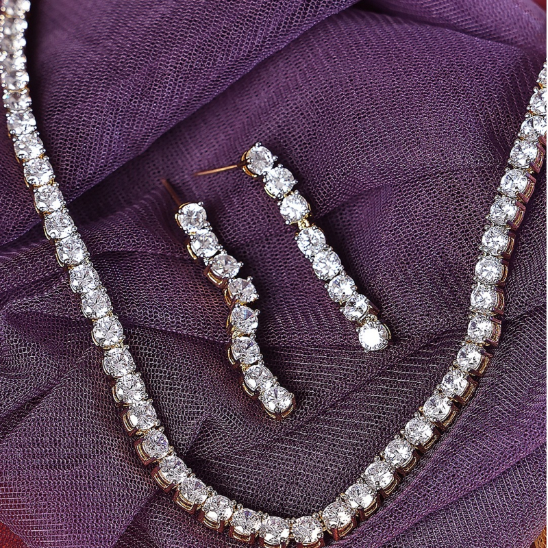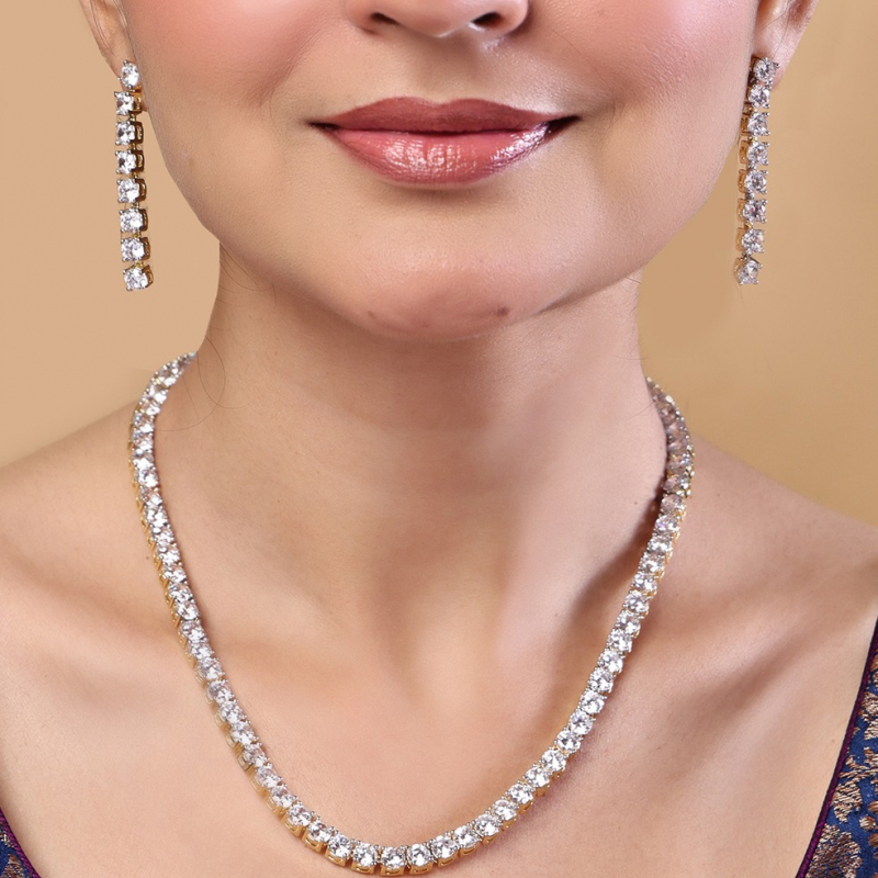 The Silver Grace AD Solitaire Necklace Set is a perfect choice for those who appreciate simplicity with elegance. Designed with sparkling white diamond-like stones, this set features a clean and minimal one-layer pattern that offers a refined and graceful look. The silver polish enhances its shine, giving it a sleek and modern appeal. Ideal for daily wear, office looks, or small gatherings, it adds a subtle touch of sophistication without being overwhelming. The finely set stones ensure lasting brilliance, while the lightweight design provides comfort. This timeless piece beautifully complements both traditional and contemporary outfits with effortless charm.