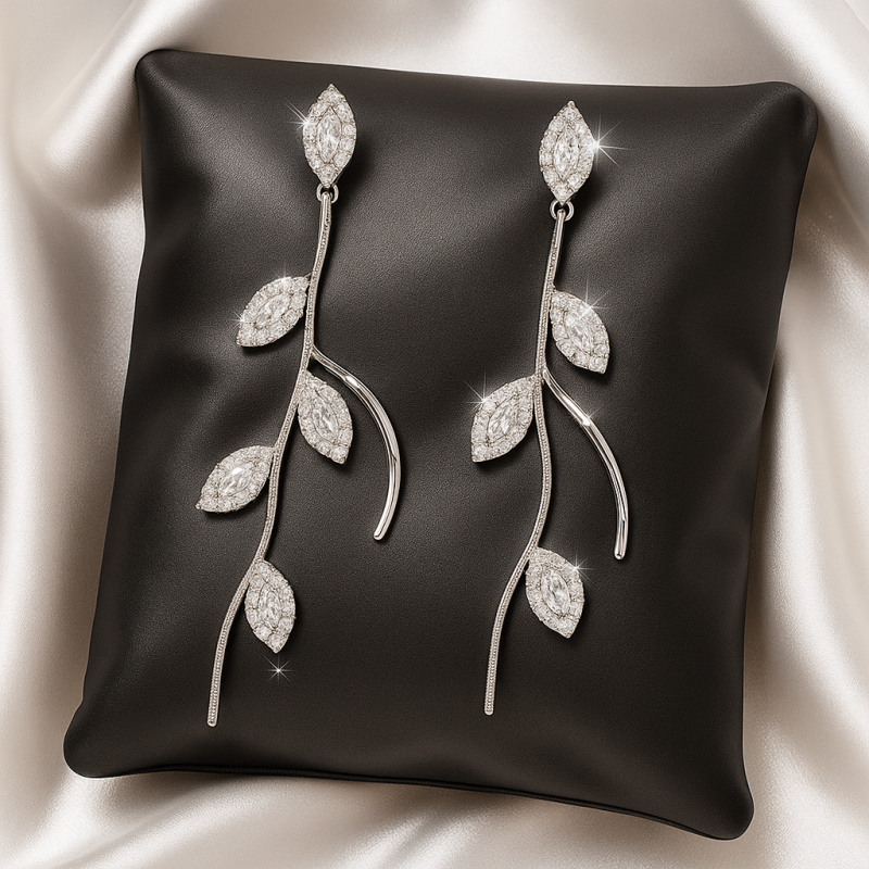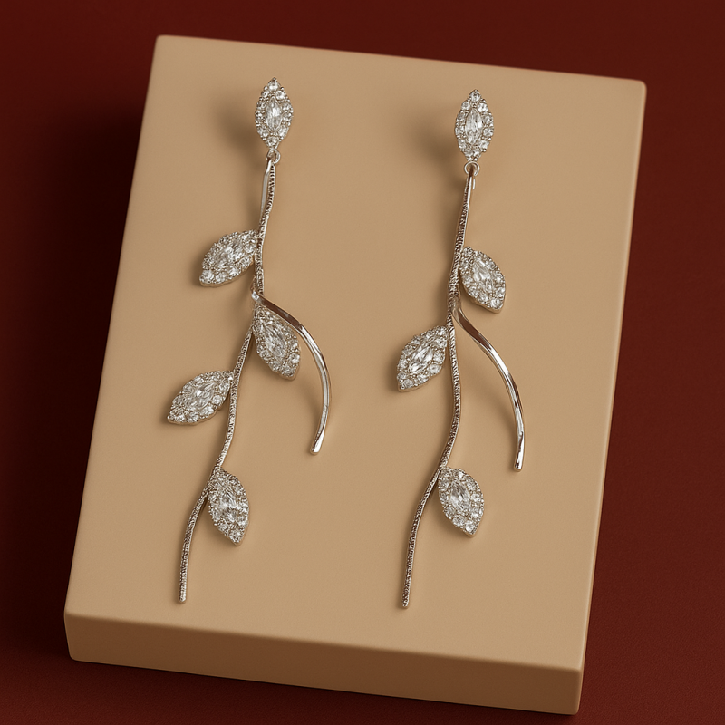 Embrace the elegance of nature with the Silver Leaf Vine Earrings, crafted with a delicate vine design adorned with sparkling American Diamond (CZ) stones. These earrings capture the beauty of cascading leaves, making them a perfect accessory for parties, festive gatherings, and elegant evenings.