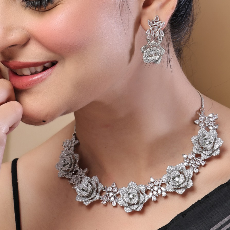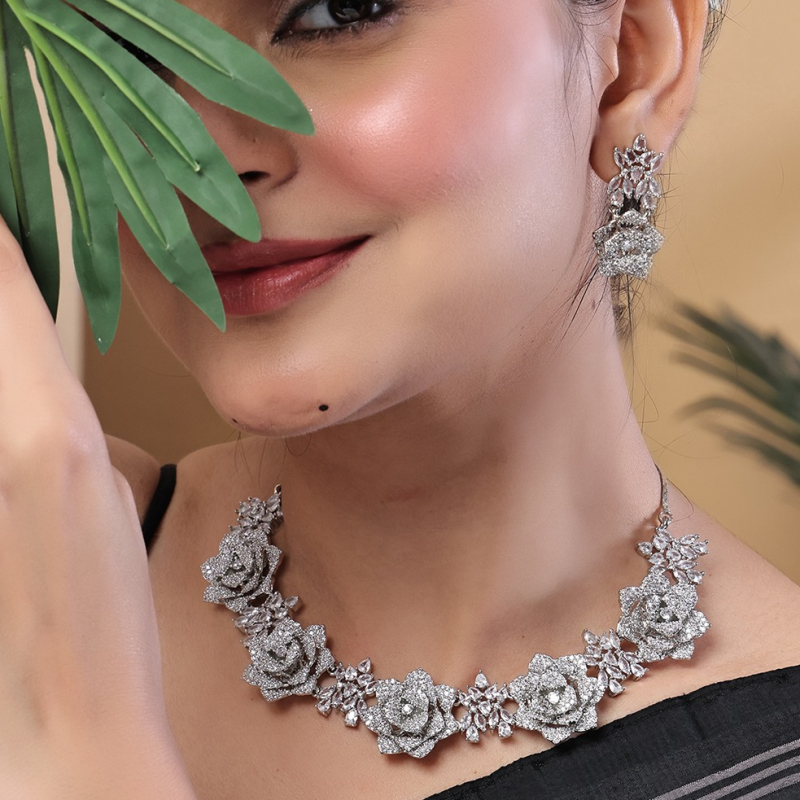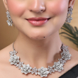The Silver Petal Bloom Choker Set is a striking piece that blends nature-inspired elegance with sparkling craftsmanship. Entirely crafted with dazzling white diamond-like stones, the choker features an intricate rose and leaf motif, giving it a delicate yet regal appeal. The silver polish enhances the brilliance of each stone, adding a radiant, reflective finish. Perfect for weddings, receptions, and festive celebrations, this choker sits comfortably around the neck while making a bold statement. Lightweight yet luxurious, it pairs beautifully with both traditional and contemporary outfits. Its unique floral design ensures you stand out with timeless grace and sophistication.