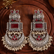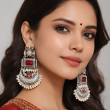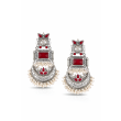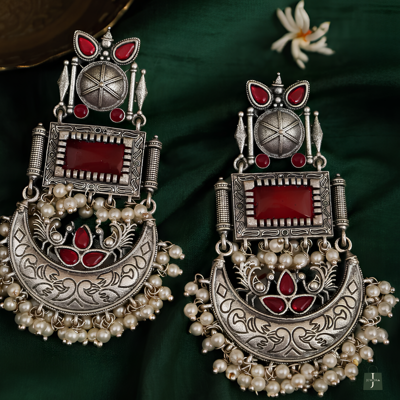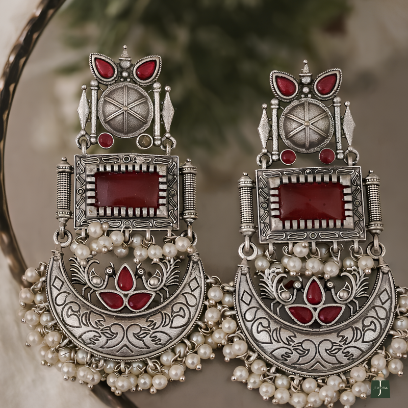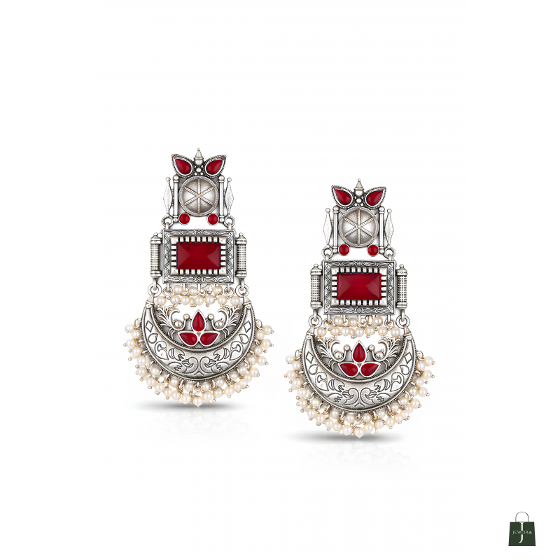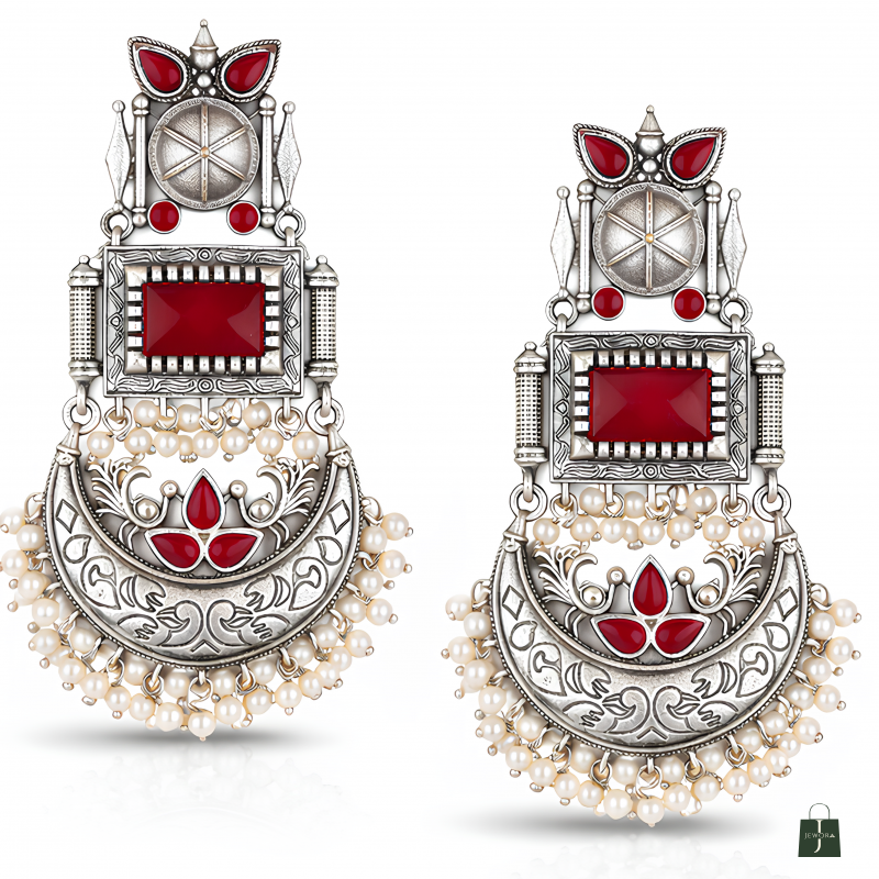 Elevate your ethnic look with these exquisitely crafted antique-style chandbali earrings. Made from durable brass and finished with elegant silver plating, these earrings feature deep ruby color stones set in intricate traditional motifs. The classic crescent-shaped chandbali design is enhanced with fine detailing and adorned with graceful pearl drops that add movement and charm.