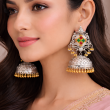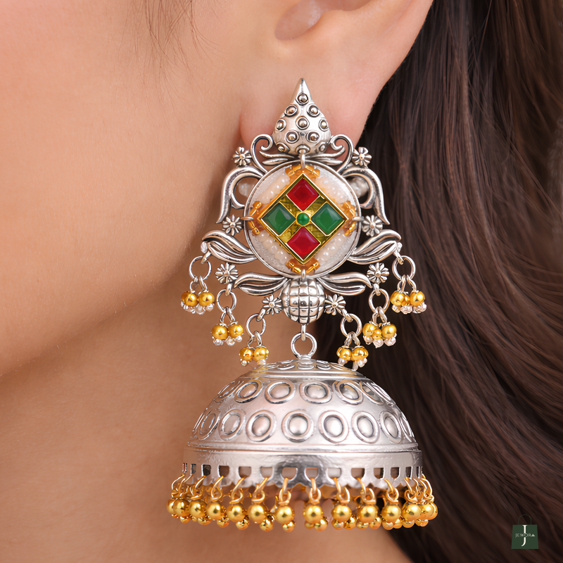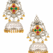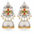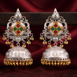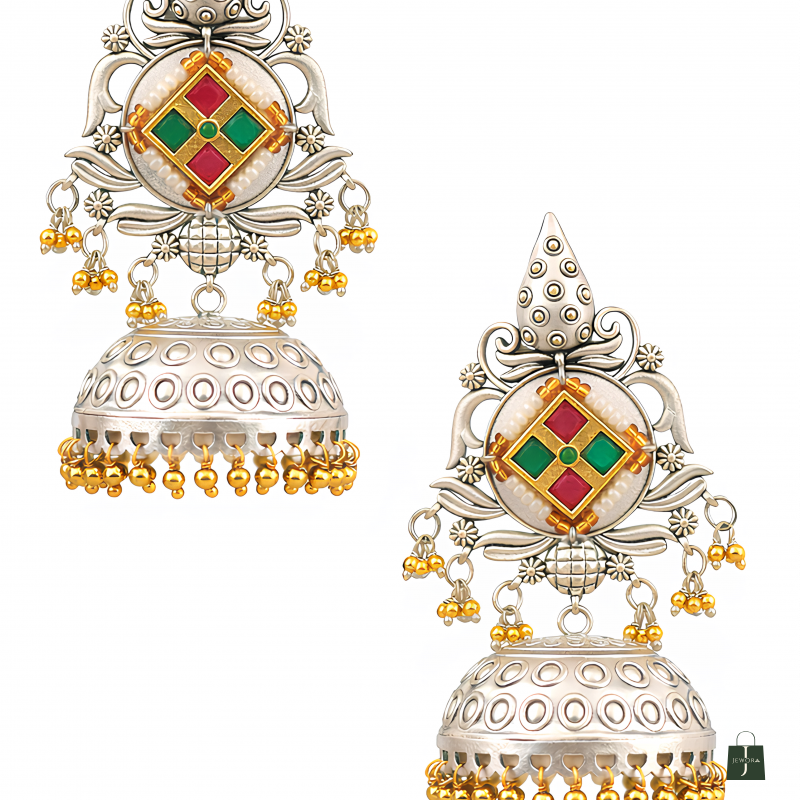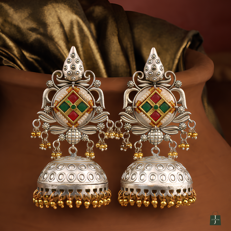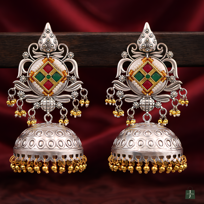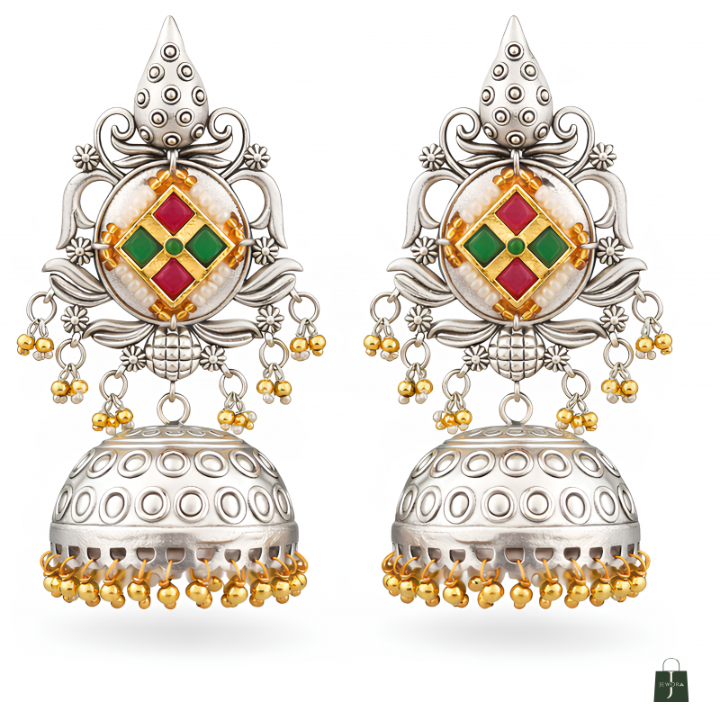 Celebrate traditional craftsmanship with these temple-inspired dome-shaped jhumka earrings crafted from durable brass and finished with silver plating. The design features a striking arrangement of ruby and green stones set in geometric detailing, enhanced with intricate motifs that reflect classic Indian artistry. The dome silhouette is complemented with pearl and bead drops, adding rich texture and graceful movement.