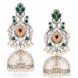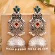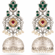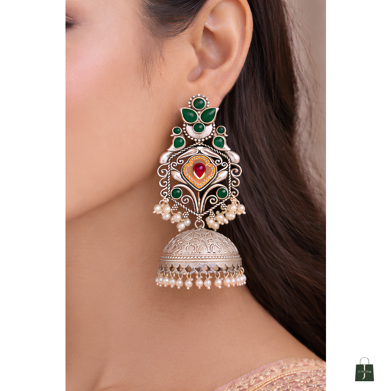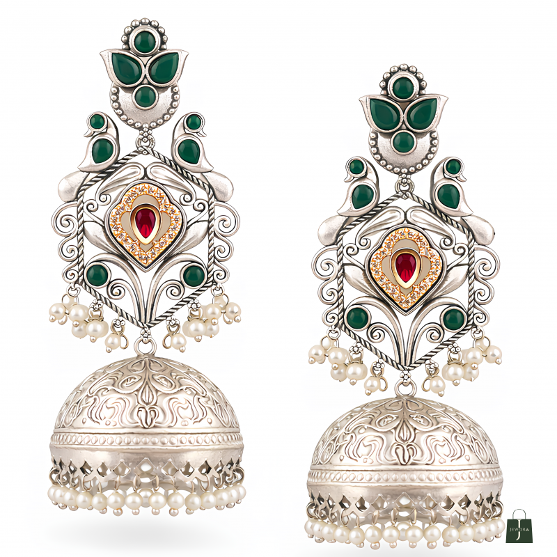 Add timeless elegance to your ethnic wardrobe with these beautifully handcrafted silver plated jhumka earrings. Designed using high-quality brass, these earrings showcase intricate traditional detailing enhanced with rich green stones and a striking red center accent. The classic dome-shaped jhumka is finished with delicate pearl drops that add graceful movement and festive charm.