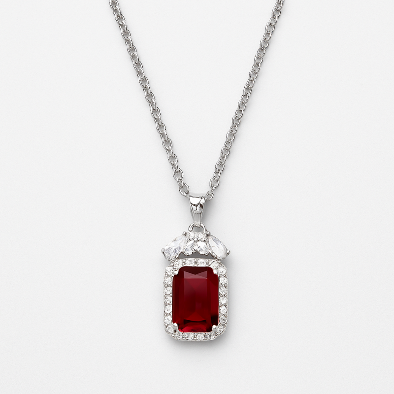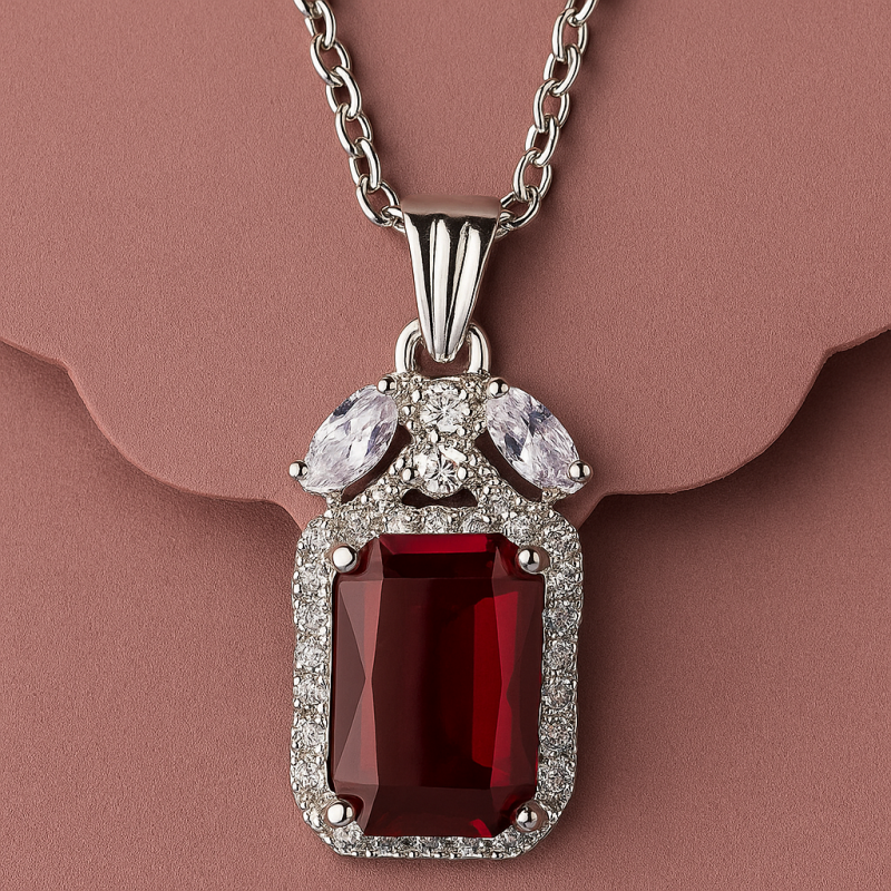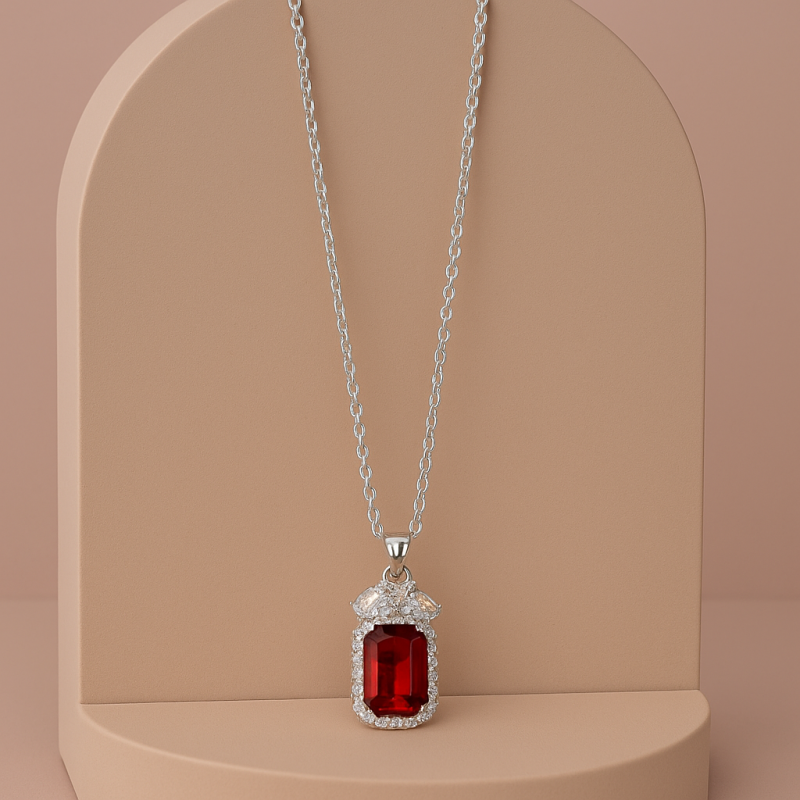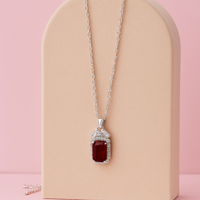 Elevate your everyday glam with this striking pendant set featuring a vivid ruby-red center stone framed by a twinkling CZ halo. The elongated rectangular gem drops from a sleek silver-finish bail and comes paired with a matching high-shine chain, giving the piece a refined, modern silhouette. Lightweight and comfortable, it layers beautifully over both ethnic and western outfits—think sarees, kurtas, or a crisp blouse. The cool silver plating enhances the richness of the ruby tone, while the halo detailing adds just the right amount of sparkle for dinner dates, parties, or festive gatherings. Finished with a reliable lobster clasp, this piece is an easy statement-maker and a thoughtful gift choice.
