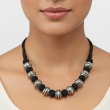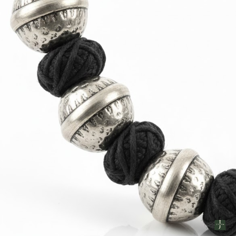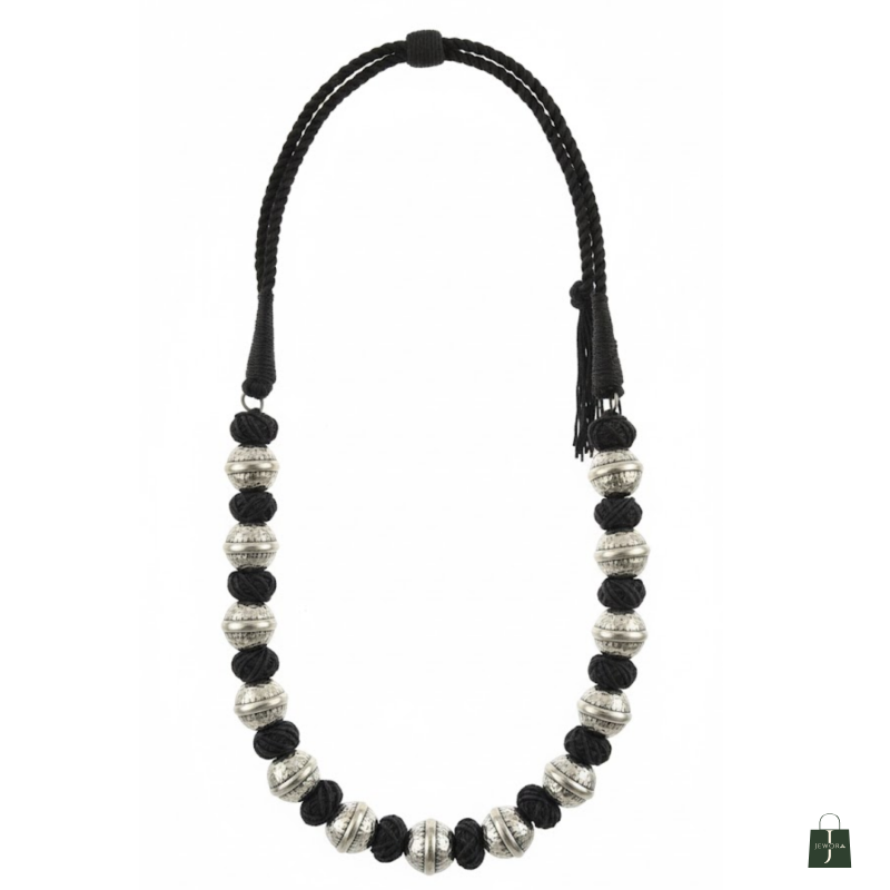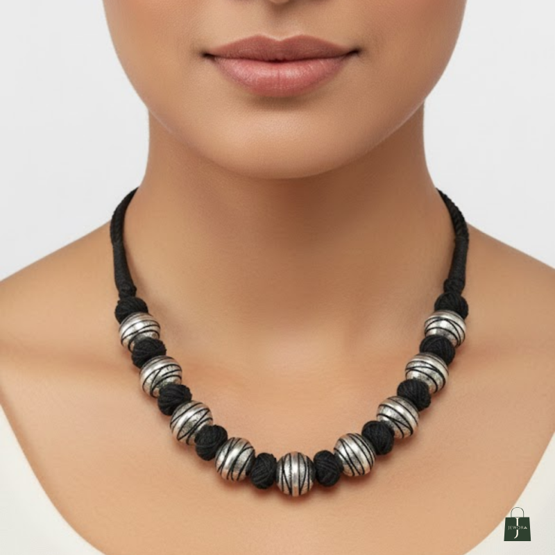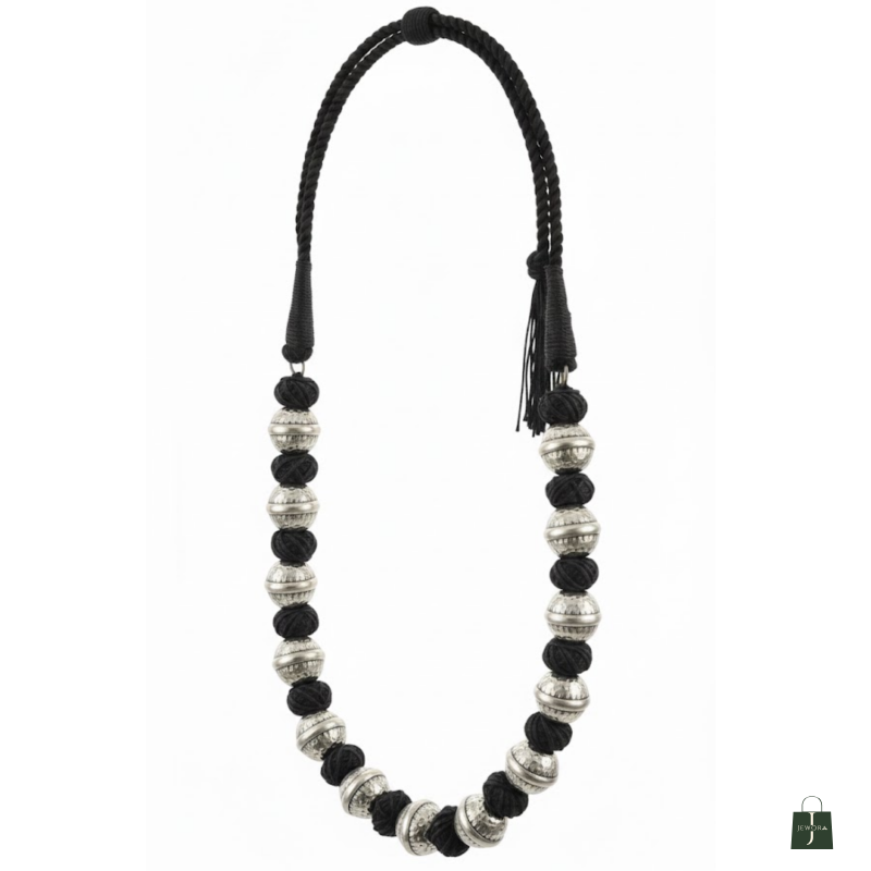 A striking handwoven tribal-style necklace featuring bold oxidized silver beads paired with black cotton knots. A statement piece that adds instant character to ethnic and fusion outfits.