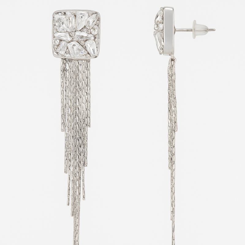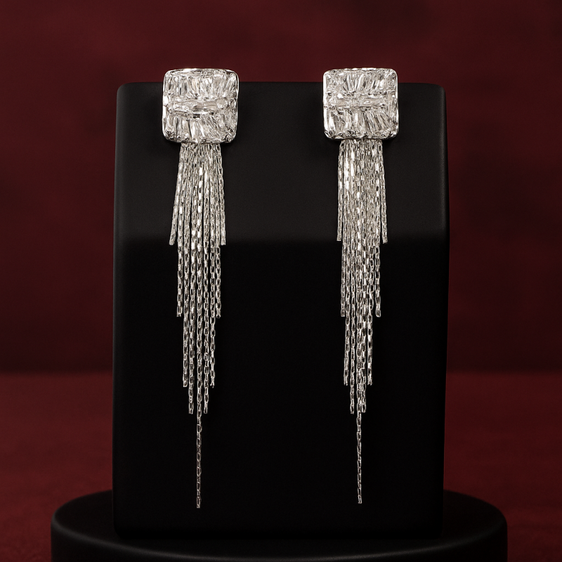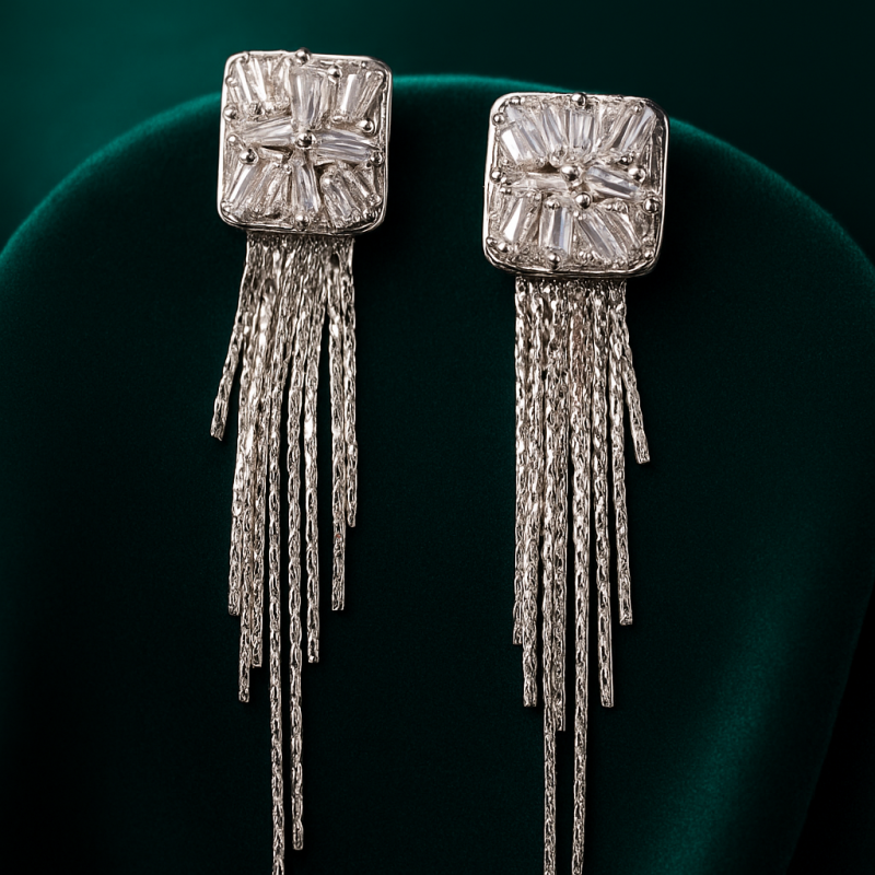 Make a bold fashion statement with the Silver Square Tassel Earrings, featuring a dazzling square stud encrusted with American Diamond (CZ) stones that flows seamlessly into shimmering silver tassel chains. The cascading tassels add movement and glamour, making these earrings the perfect accessory for evening parties, weddings, and festive occasions.