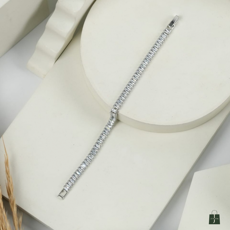 Elevate your everyday elegance with this stunning silver tennis bracelet, designed to bring timeless sparkle to any look. Crafted with precision, the bracelet features a continuous line of shimmering rectangular-cut stones, each expertly set to reflect light from every angle. Its sleek, minimalist design makes it a versatile accessory—perfect for daily wear, special occasions, or effortless layering with other bracelets.