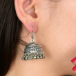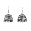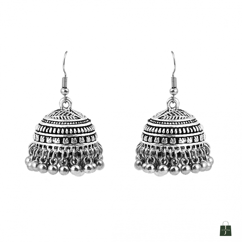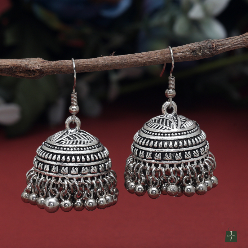 Enhance your ethnic look with these oxidised silver-plated jhumka earrings. Designed with a dome shape, intricate engravings, and ghungroo beads, they bring timeless charm to any outfit. Lightweight and versatile, they pair beautifully with sarees, kurtis, lehengas, or fusion wear for festive occasions or daily ethnic style.