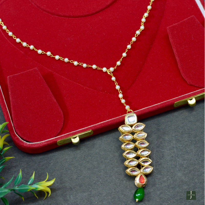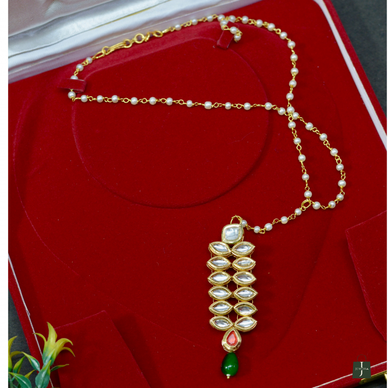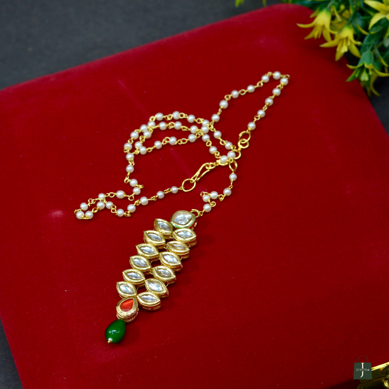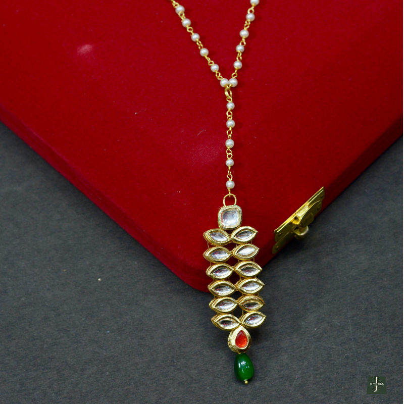 This Single Drop Kundan Pendant Necklace highlights a striking central drop paired with delicate pearl chains. Its minimal yet elegant design offers a luxury-inspired look that suits daily wear, festive styling, and effortless layering without appearing heavy or overly ornate.